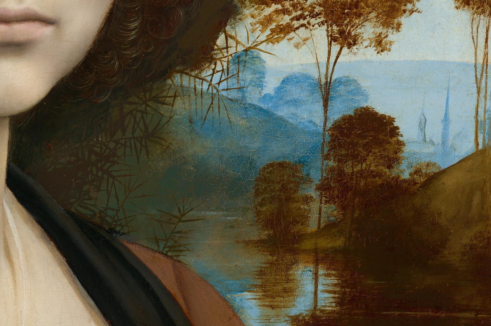 This square portrait shows the head and shoulders of a young woman in front of a spiky bush that fills much of the background except for a landscape view that extends into the deep distance to our right. The woman’s body is angled to our right but her face turns to us. She has chalk-white, smooth skin with heavily lidded, light brown eyes, and her pale pink lips are closed. Pale blush highlights her cheeks, and she looks either at us or very slightly away from our eyes. Her brown hair is parted down the middle and pulled back, but tight, lively curls frame her face. Her hair turns gold where the light shines on it. She wears a brown dress, trimmed along the square neckline with gold. The front of the bodice is tied with a blue ribbon, and the lacing holes are also edged with gold. A sheer white veil covers her chest and is pinned at the center with a small gold ball. The bush fills the space around her head with copper-brown, spiky leaves. A river winds between trees and rolling hills in the distance to our right. Trees and a town along the horizon, which comes about halfway up the painting, is pale blue under an ice-blue sky. She was the daughter of a wealthy Florentine banker, and her portrait—the only painting by Leonardo da Vinci in the Americas—was probably commissioned about the time of her marriage at age 16. Leonardo himself was only about six years older. The portrait is among his earliest experiments with the new medium of oil paint; some wrinkling of the surface shows he was still learning to control it. Still, the careful observation of nature and subtle three–dimensionality of Ginevra‘s face point unmistakably to the new naturalism with which Leonardo would transform Renaissance painting. Ginevra is modeled with gradually deepening veils of smoky shadow—not by line, not by abrupt transitions of color or light. Other features of Ginevra‘s portrait reveal young Leonardo as an innovator. He placed her in an open setting at a time when women were still shown carefully sheltered within the walls of their family homes, with landscapes glimpsed only through open windows. The three–quarter pose, which shows her steady reserve, is among the first in Italian portraiture, for either sex. At some time in the past, probably because of damage, the panel was cut down by a few inches along the bottom, removing Ginevra‘s hands. A drawing by Leonardo survives that suggests their appearance—lightly cradled at her waist and holding a small sprig, perhaps a pink, a flower commonly used in Renaissance portraits to symbolize devotion or virtue. Ginevra‘s face is framed by the spiky, evergreen leaves of a juniper bush, the once–brighter green turned brown with age. Juniper refers to her chastity, the greatest virtue of a Renaissance woman, and puns her name. The Italian for juniper is ginepro. The vast majority of female portraits were commissioned on one of two occasions: betrothal or marriage. Wedding portraits tend to be made in pairs, with the woman on the right side. Since Ginevra faces right, this portrait is more likely to have commemorated her engagement. Her lack of obvious finery, however, is somewhat surprising. Jewels, luxurious brocades, and elaborate dresses were part of dowry exchanges and displayed a family’s wealth.