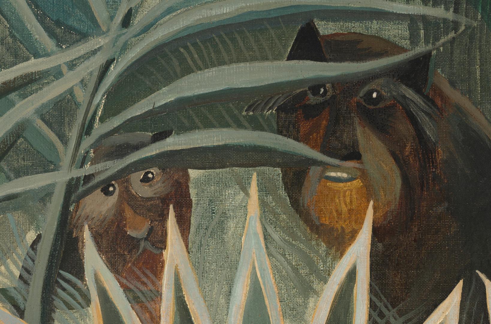 Two animals with golden yellow, brown, and black fur peer out from behind dense jungle foliage in this stylized, vertical painting. Most of the composition is filled with broadly painted areas of sage, olive, moss, and lemon-lime green to create an impenetrable wall of plants and growth. An oval of slate-blue sky to the left of upper center is framed by plants that grow up and off the top corners of the painting. Small in scale and nestled back among the growth near the lower center, the animal to our right has black eyes that look at or toward us, a long nose, and gray around its mouth and eyes. It has triangular ears and its body, which extends to our right, is dark brown with a lifted tail. To our left, another smaller animal, perhaps a baby, is mostly obscured by a fern frond and grass. This animal has small black eyes and chestnut-brown and black fur. Three large, stylized flowers with fuchsia-pink centers and pale petals grow above the animals, to our left. An oversized white hyacinth grows to our right. A narrow, brick-red bird sits on a branch above the pink flowers, almost lost among the plants. The artist signed and dated the lower right corner, “Henri Julien Rousseau 1909.” (NGA)