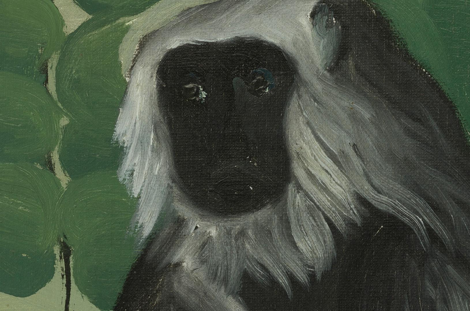 Born in 1844 to a working-class family in Laval, France, Henri Rousseau worked briefly for a lawyer and served a stint in the military before taking a position at a French customs post in 1868; the nickname “Le Douanier” (the customs inspector) remained with him even after his retirement in 1893. Very poor, Rousseau was a self-taught painter who harbored dreams of official approval. Although he never achieved recognition from the French academy, he was embraced by early 20th-century avant-garde artists, including Picasso and the surrealists, for his departures from conventional style, which included broad, flat planes of color, stylized line, and fantastic landscapes. While he painted exotic locales, Rousseau never left France; his jungles are the dreams of a city dweller, constructed from visits to the botanical gardens, the Paris zoo, and colonial expositions, and culled from prints and reproductions. Tropical Forest with Monkeys was painted during the last months of Rousseau‘s life. It shows one of his signature exotic landscapes, lush, tropical, and virgin. Many of the animals in Rousseau‘s images have human faces or attributes. The central monkeys in this painting hold green sticks from which strings appear to dangle, suggesting fishing poles and human leisure activities, thereby emphasizing the quasi-human experience of the animals. In this sense Rousseau‘s anthropomorphized primates can be seen not as true wild beasts, but rather as representing an escape from the “jungle” of Paris and the everyday grind of civilized life. In an age of colonial expansion and large-scale expeditions, the popular press was full of images of westerners at ease in the jungle. Rousseau, for example, kept in his studio the Bêtes sauvages album published by the department store Galeries Lafayette. One of the most striking aspects of Rousseau‘s style is the flattening of his subjects. Whether he was echoing his impressionist contemporaries, who were concerned with surface, or simply following his own vision, the artist’s jungle paintings lack solidity, as if they were representations of theatrical décor, the gigantic leaves and petals minimally contoured so as to create the effect of overlapping cutouts. Moreover, his creatures seem deliberately subdued by a deadpan treatment that identifies each more as outline than as a tactile form. As his career progressed, Rousseau increasingly associated with the avant-garde, and in 1905 he exhibited alongside the Fauves at the Salon d’Automne. Gradually his reputation grew, and sales of his work had increased considerably by 1910, when he fell victim to an infection and died. His funeral was attended by Paul Signac and Guillaume Apollinaire composed a whimsical poem that Constantin Brancusi chiseled into the tombstone, thereby situating Rousseau an unwitting godfather of modernism.