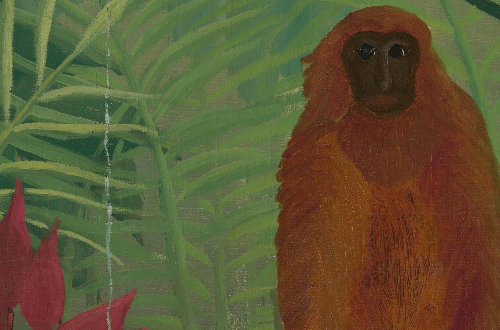 Five monkeys rest and play amid a lush jungle landscape in this horizontal landscape painting. Painted with areas of flat color, thick vegetation fills most of the scene, with giant leaves overlapping in shades of green. At the bottom center, a large brown monkey sits upright on a rock, looking directly at us. To our left, two gray and black monkeys climb in trees, and also face us. To our right, two rust-orange monkeys swing in trees. The orange of their fur is echoed in spiky, pumpkin-orange flowers to the right. Dark red leafy plants with spiky white flowers fill the lower left corner of the painting. A cloudless, pale blue sky stretches across the top of the composition. The artist signed and dated the painting with white letters in the lower right: “Henri Rousseau 1910.” (NGA)