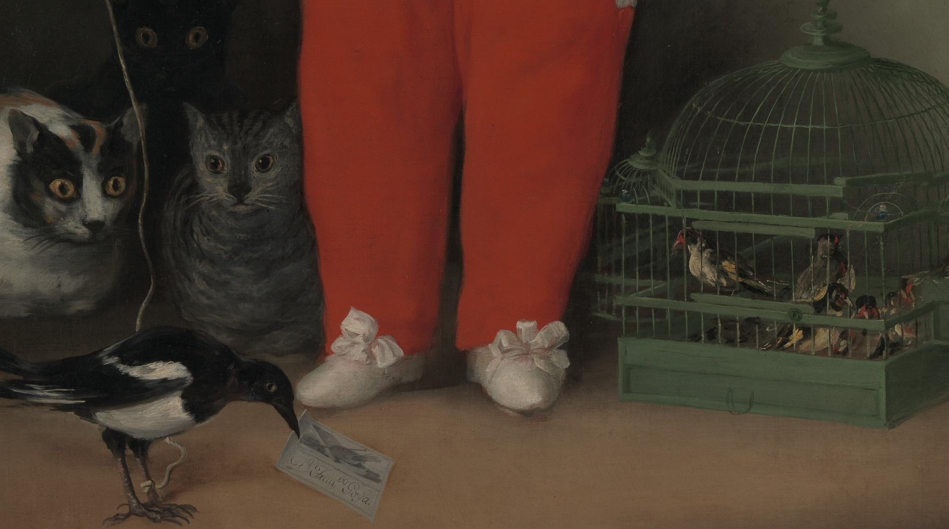 Outfitted in a splendid red costume, the son of the count and countess of Altamira is shown between a cage of finches and three wide-eyed cats who appear captivated by the boy’s pet magpie. In its beak the magpie holds Goya’s calling card and signature. Goya may have intended this cast of animals as a reminder of the frail boundaries that separate the child’s world from the forces of evil, or as a commentary on the fleeting nature of innocence and youth. Manuel died only a few years after his portrait was painted, at the age of eight. (MET)