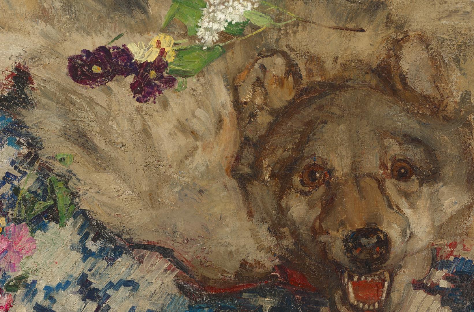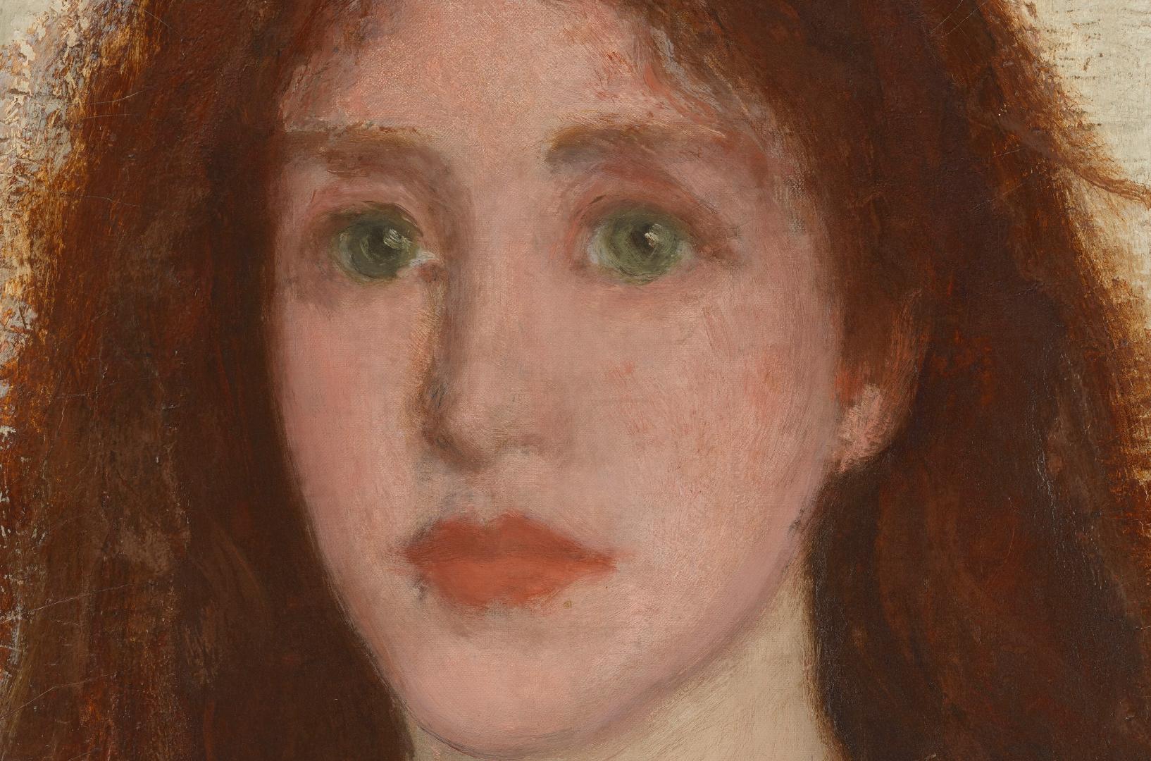 When Whistler submitted The White Girl to the Paris Salon in 1863, the tradition–bound jury refused to show the work. Napoleon III invited avant–garde artists who had been denied official space to show their paintings in a “Salon des Refusés,” an exhibition that triggered enormous controversy. Whistler‘s work met with severe public derision, but a number of artists and critics praised his entry. In the Gazette des Beaux–Arts, Paul Manz referred to it as a “symphony in white,” noting a musical correlation to Whistler‘s paintings that the artist himself would address in the early 1870s, when he retitled a number of works “Nocturne,” “Arrangement,” “Harmony,” and “Symphony.” Whistler used variations of white pigment to create interesting spatial and formal relationships. By limiting his palette, minimizing tonal contrast, and sharply skewing the perspective, he flattened forms and emphasized their abstract patterns. This dramatic compositional approach reflects the influence of Japanese prints, which were becoming well known in Paris as international trade increased. Clearly, Whistler was more interested in creating an abstract design than in capturing an exact likeness of the model, Joanna Hiffernan. His radical espousal of a purely aesthetic orientation and the creation of “art for art’s sake” became a virtual rallying cry of modernism. A young woman with pale, peachy skin, wearing a long, flowing white dress, stands in front of a white curtain in this vertical portrait painting. Her auburn-red hair cascades down over and behind her shoulders. She looks to our left with green eyes, and her pink, full lips are closed. Her dress has puffed shoulders above a white-on-white striped pattern on the long sleeves. She stands on an animal pelt; it is not clear whether it is a wolf or a bear. The pelt spans the width of the painting and overlaps a blue patterned carpet. The animal’s mouth gapes to show sharp teeth. Its glassy eyes are wide open, and it seems to look at us. The edges of the animal skin are red. The woman holds a white lily by her side in her left hand, while yellow and purple flowers lie scattered on the pelt. (NGA)