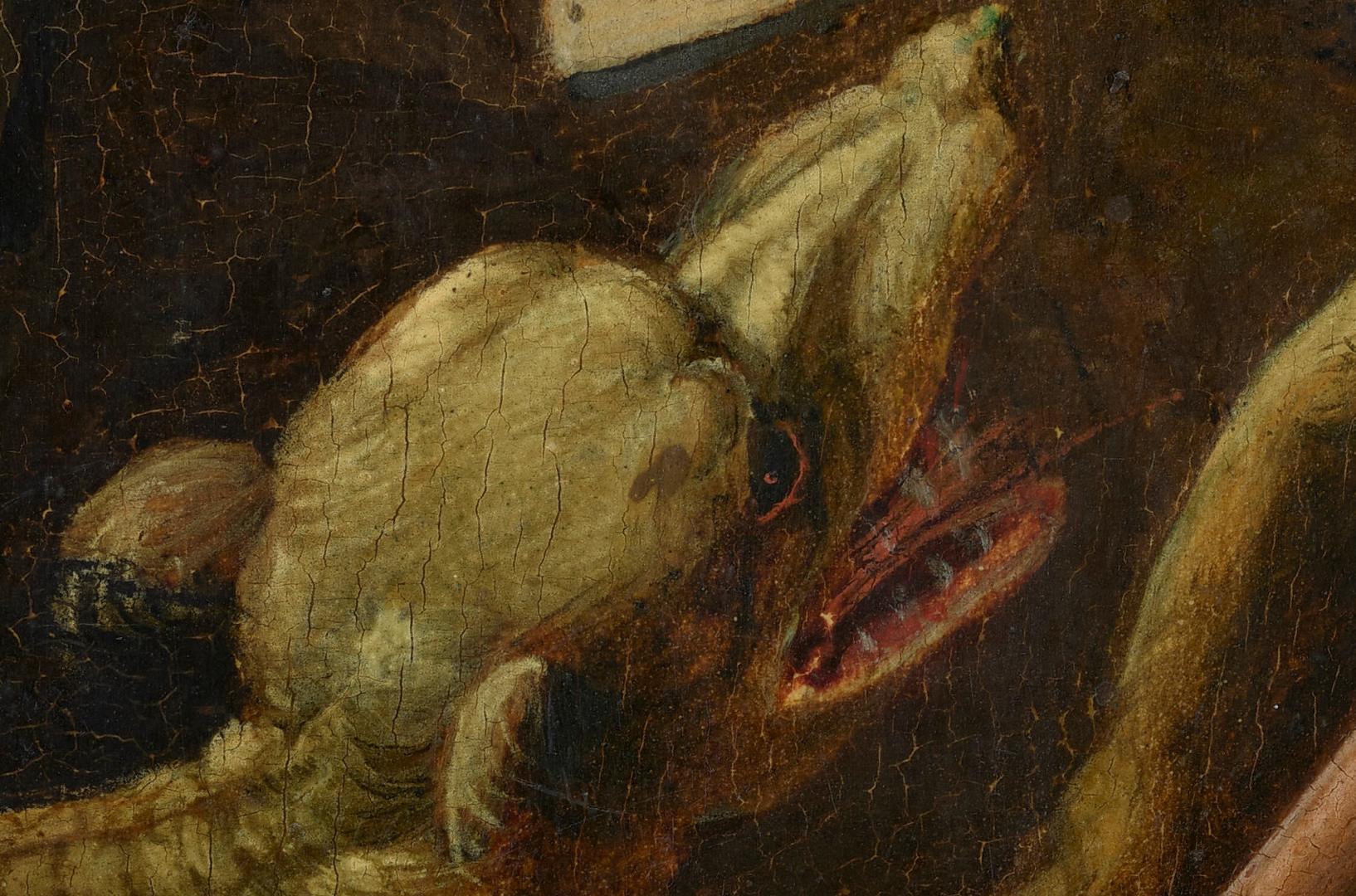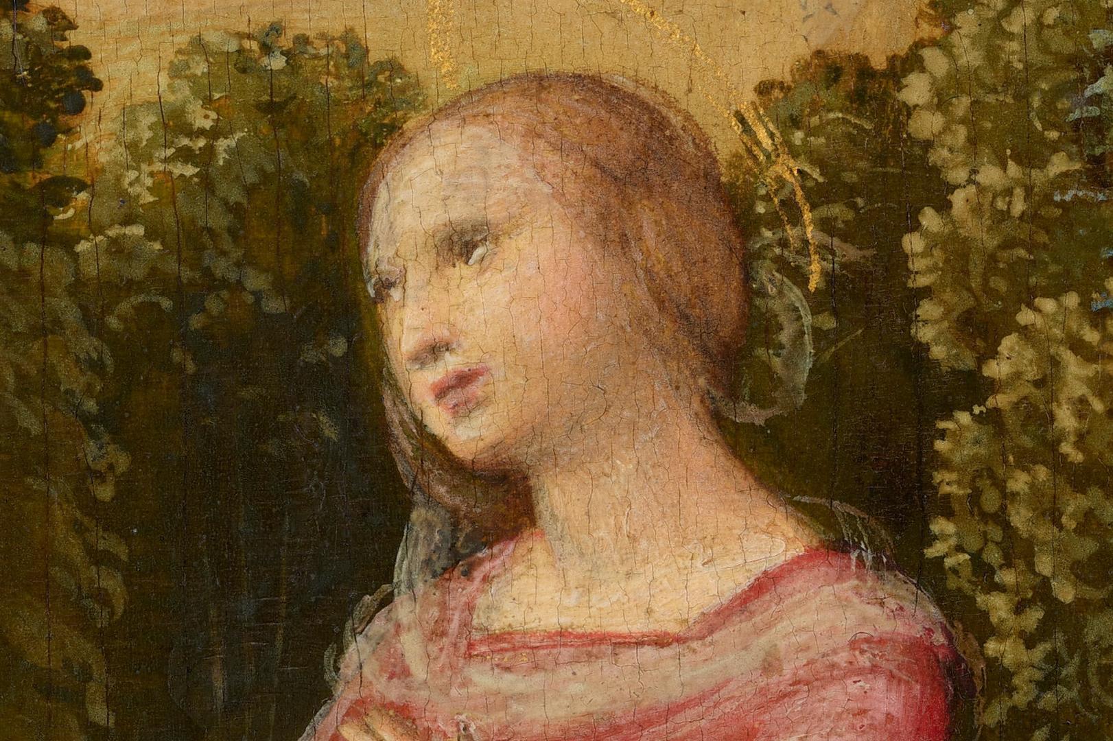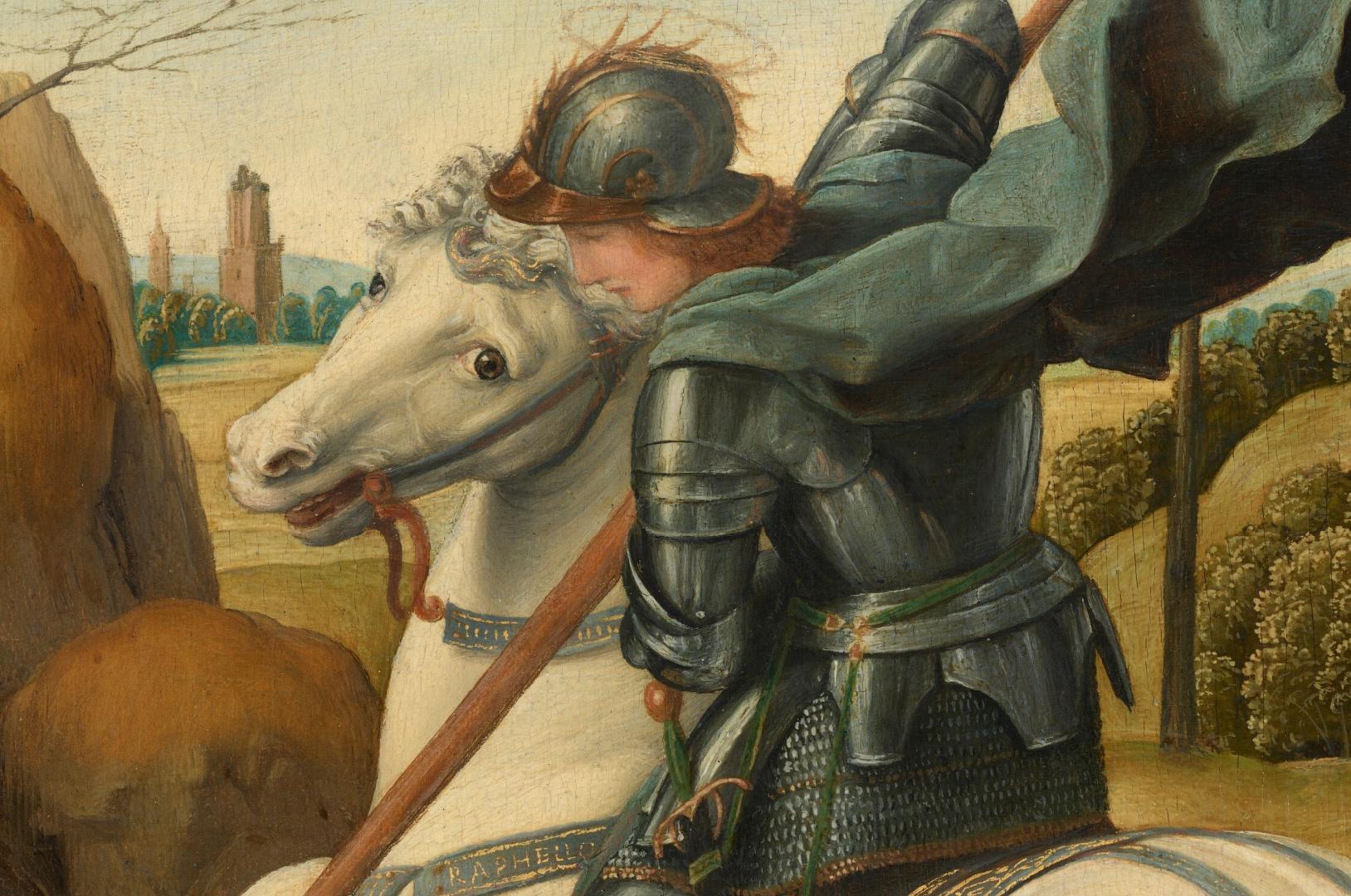 Raphael was born in Urbino, a central Italian duchy noted for its elegant gentility and Renaissance scholarship. He moved to Florence toward the end of 1504. Saint George and the Dragon, one of two versions of the theme by the artist, belonged to a series of miniature panels that Raphael painted in Florence for the celebrated court of Urbino. A Roman soldier of Christian faith, Saint George saved the daughter of a pagan king by subduing a dragon with his lance; the princess then led the dragon to the city, where the saint killed it with his sword, prompting the king and his subjects to convert to Christianity. One unusual feature of the painting is the saint’s blue garter on his armor–covered leg. Its inscription, HONI, begins the phrase Honi soit qui mal y pense (Disgraced be he who thinks ill of it), the motto of the chivalric Order of the Garter, of which George is the patron saint. Duke Guidobaldo da Montefeltro of Urbino was made a knight of the prestigious order in 1504 by King Henry VII of England. Scholarship has shown that the panel was made for the king’s emissary, Gilbert Talbot, and not as a gift directly for the king, as was previously thought. A man wearing armor, sitting astride a cream-white horse, drives a long lance down at a lizard-like dragon as a woman kneels with her hands in prayer in the landscape beyond in this vertical painting. Both people have pale skin and thin, gold halos floating above their heads. At the center of the composition, the man faces our left in profile as he looks down at the creature. The man has a straight nose and honey-brown hair under his gold-trimmed, pewter-gray helmet. Armor covers his entire body, and a celestial-blue cape billows behind him from where it fastens around his neck. A narrow, indigo-blue and gold band is tied around his left calf, and is inscribed with the word “HONI.” A black sword hangs from his left side. The horse is white with a silvery-white mane and tail. It rears on its hind legs as it turns its head to look at us with hazel-brown eyes. The horse wears a blue saddle and bridle, the same color as the man’s cape, trimmed with gold. A strap around the horse’s neck is painted in gold with the name, “RAPHELLO.” The rider thrusts his foot into the stirrup we can see as he plunges a lance down at the dragon under the horse’s front feet. The dragon has tawny brown skin with a mint green, dog-like head. It grips the earth with clawed feet as at pushes at the lance with one front foot. It twists its long, snake-like neck to look at the man with dark eyes. The dragon opens its pointed snout to show its teeth, and bat-like wings splay out. A tall outcropping over a cave rises along the left edge of the composition, behind the dragon. In a field a little farther back, to our right, the woman kneels with her body angled to our left. She tilts her head away from us and gazes past the man and horse. She has a straight nose, pale pink, bow-shaped lips, and her blond hair is pulled back in a bun. She wears a ruby-red dress and a sheer white wrap around her shoulders and across her arms. Around the woman, straw-yellow hills with bands of pine-green trees roll into the distance. Two terracotta-orange towers rise from a row of trees along the horizon. A few taller trees are outlined against the baby-blue sky, which lightens toward the horizon. (NGA)