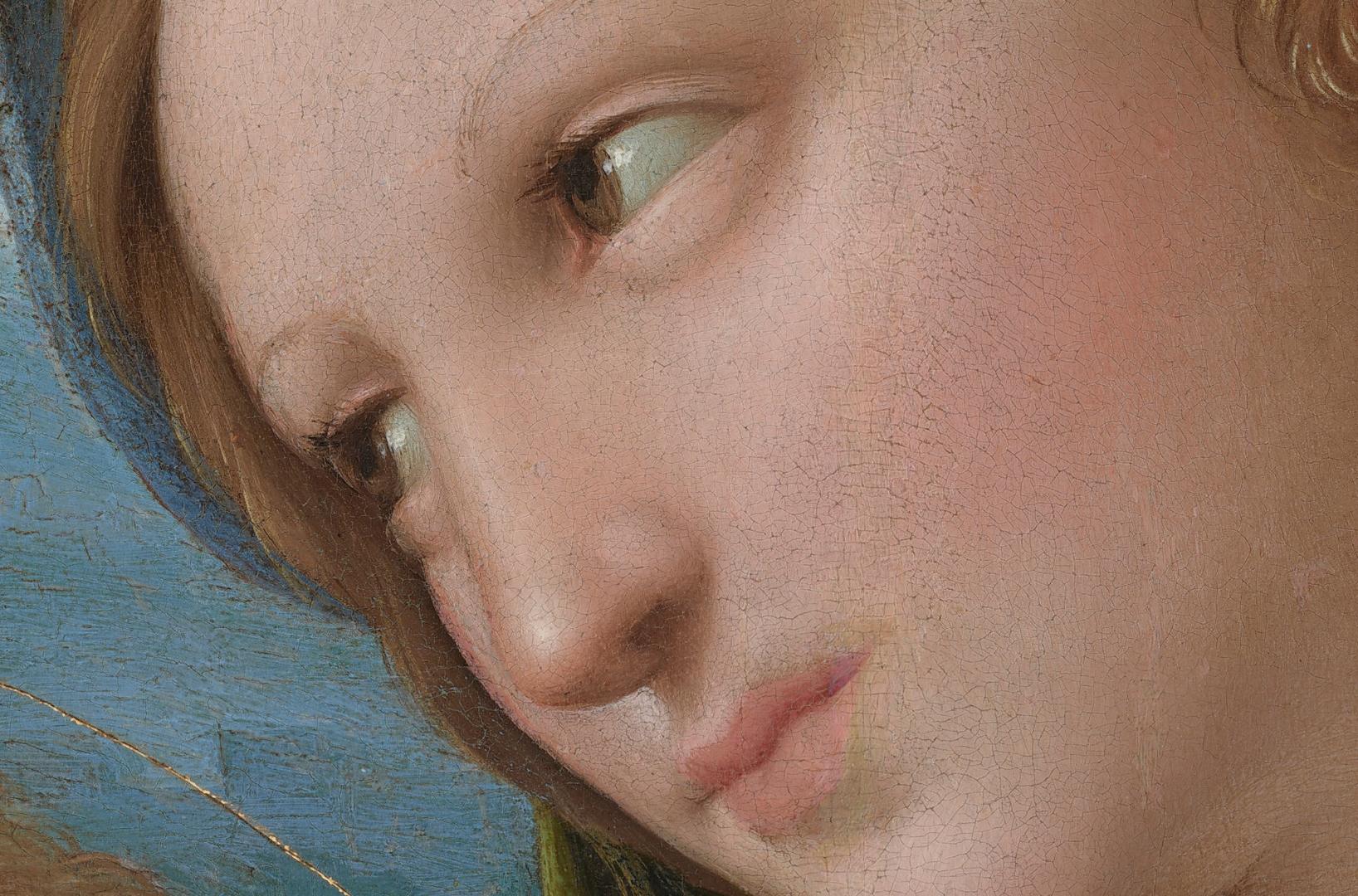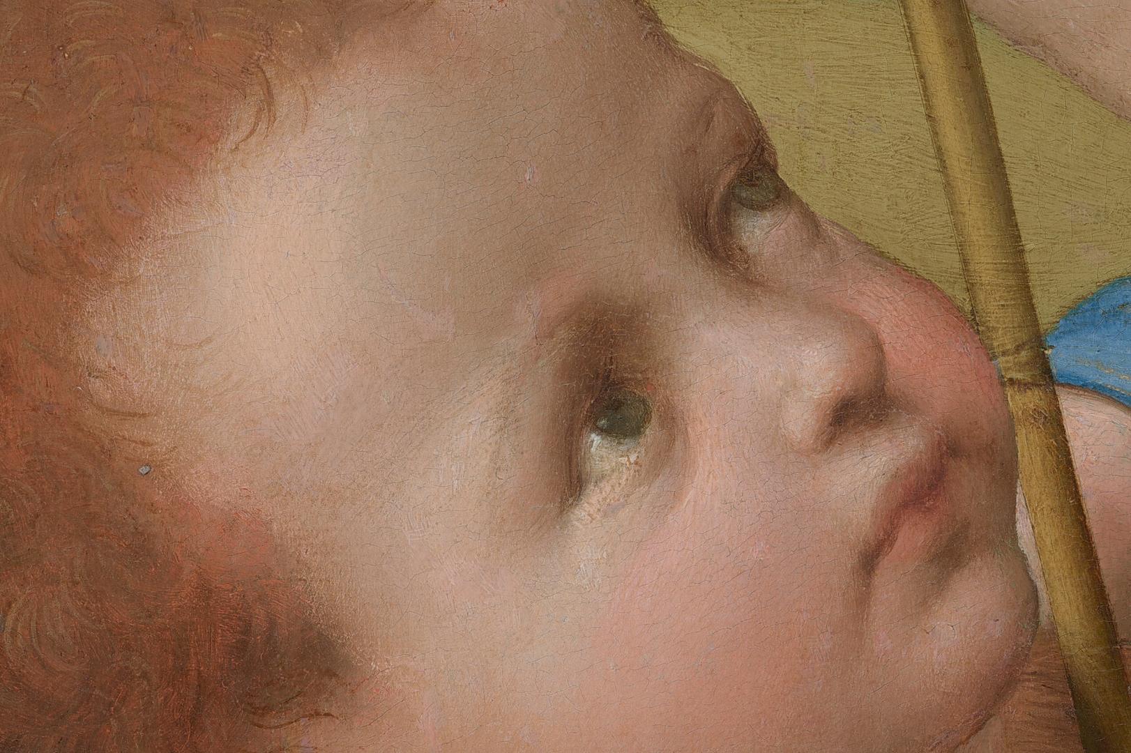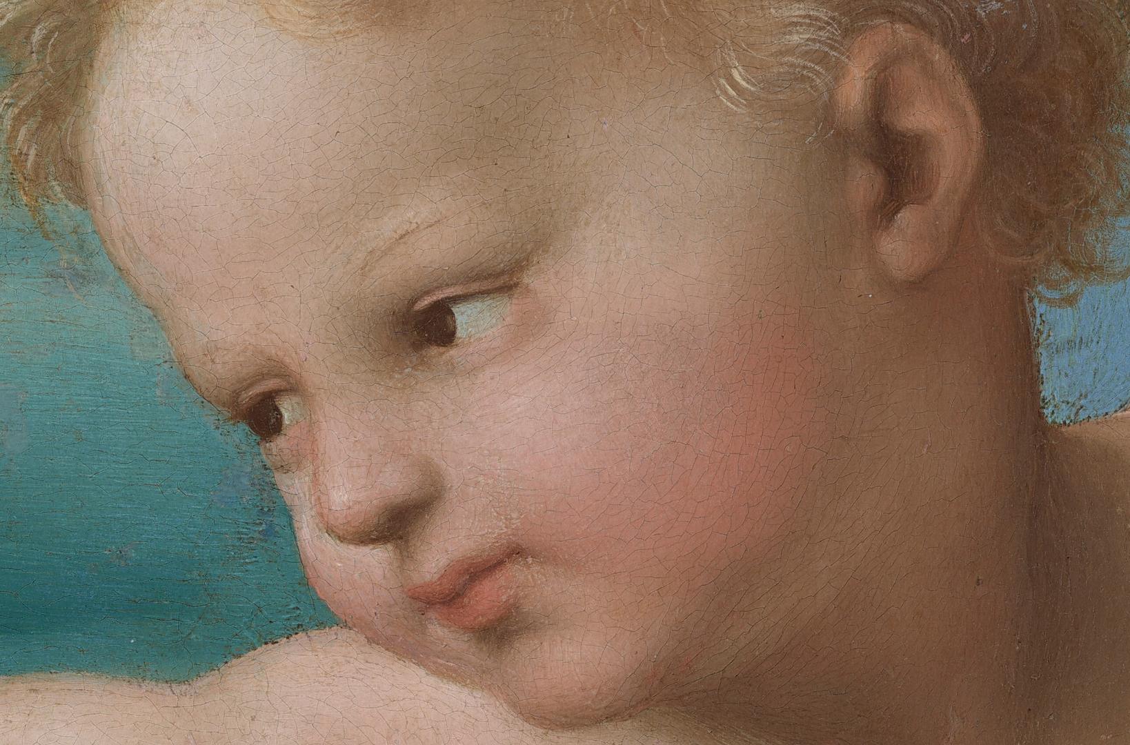 After four years in Florence, Raphael moved to Rome in 1508, probably to execute more significant commissions under the papal reign of Julius II. The major work in America from Raphael‘s Roman period is The Alba Madonna. In this “Madonna of Humility” the Virgin is seated directly on the ground instead of on a heavenly throne or a sumptuous cushion. The artist grouped the figures in a broad low pyramid, aligning them within a circle in such a way that they not only conform to their space, but dominate it as well. The tondo, or round–format style, was popular in Florentine painting, and the influence of the Florentine masters Michelangelo and Leonardo is also apparent in the work. The Alba Madonna shows the Roman style Raphael adapted, in the painting’s delicacy of color and mood, with figures draped in rose pink, pale blue, and green, set in an idealized, classical landscape. The Madonna is dressed in an antique costume of turban, sandals, and flowing robes. The serene, bucolic atmosphere of Raphael‘s tondo belies its emotional meaning. The Christ Child’s gesture of accepting the cross from the Baptist is the focus of attention of all three figures, as if they have foreknowledge of Christ’s sacrifice for mankind. A woman and two children, all with pale skin and flushed cheeks, sit together in a landscape in this round painting. The woman takes up most of the composition as she sits with her right leg, to our left, tucked under her body. Her other leg, on our right, is bent so the foot rests on the ground, and that knee angles up and out to the side. She wears a rose-pink dress under a topaz-blue robe, and a finger between the pages of a closed book holds her place. Her brown hair is twisted away from her face. She has delicate features and her pink lips are closed. She looks and leans to our left around a nude young boy who half-sits and half-stands against her bent leg. The boy has blond hair and pudgy, toddler-like cheeks and body. The boy reaches his right hand, on our left, to grasp the tall, thin cross held by the second young boy, who sits on the ground next to the pair. This second boy has darker brown hair and wears a garment resembling animal fur. The boy kneels facing the woman and looks up at her and the blond boy. The trio sits on a flat, grassy area in front of a body of water painted light turquoise. Mountains in the deep distance are pale azure blue beneath a nearly clear blue sky.