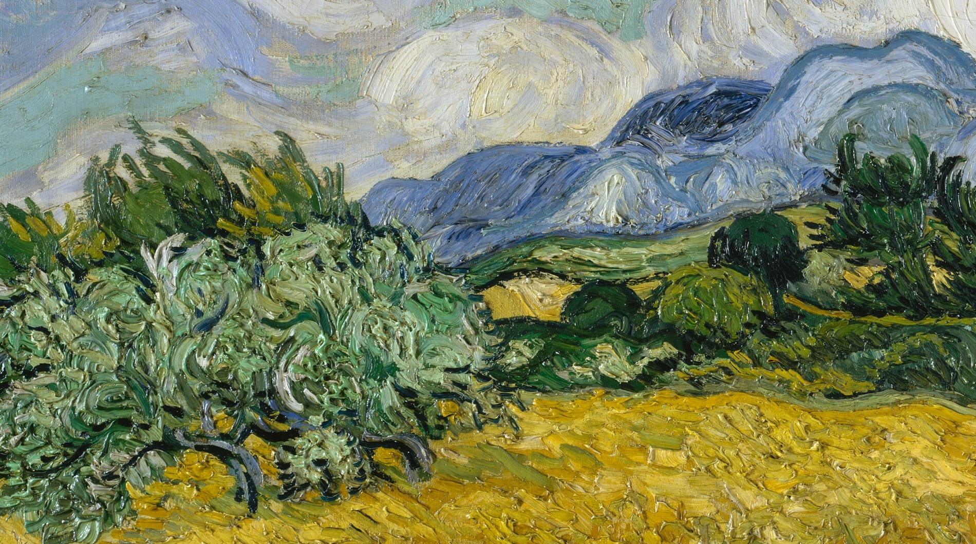 Cypresses gained ground in Van Gogh’s work by late June 1889 when he resolved to devote one of his first series in Saint-Rémy to the towering trees. Distinctive for their rich impasto, his exuberant on-the-spot studies include the Met’s close-up vertical view of cypresses (49.30) and this majestic horizontal composition, which he illustrated in reed-pen drawings sent to his brother on July 2. Van Gogh regarded the present work as one of his “best” summer landscapes and was prompted that September to make two studio renditions: one on the same scale (National GalleryLondon) and the other a smaller replica, intended as a gift for his mother and sister (private collection). (MET)