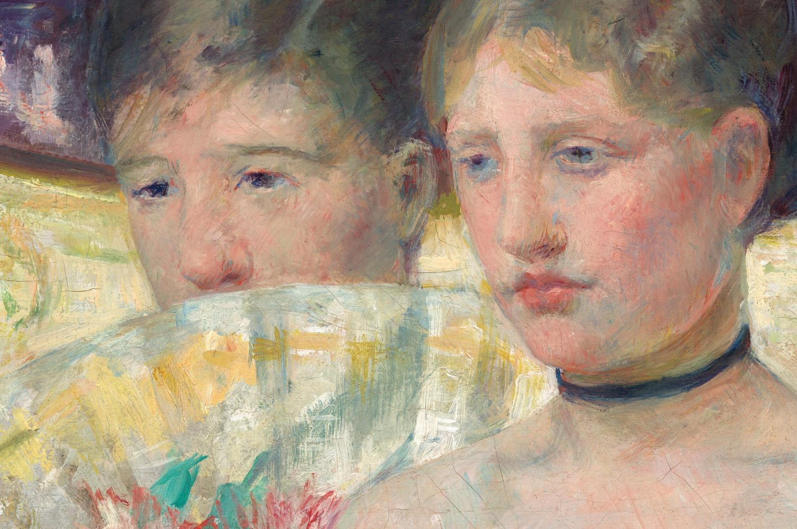Shown from the knees up, two young women with pale, peachy skin wearing white gowns sit close together and almost fill this vertical painting. The women are angled to our left and look in that direction. The young woman on our right has a heart-shaped face, dark blond hair gathered at the back of her head, and light blue eyes. Her full, coral-pink lips are closed, the corners in greenish shadows. Her dress is off the shoulders, has a tightly fitted bodice, and the skirt pools around her lap. The fabric is painted in strokes of pale shell pink, faint blue, and light mint green but our eye reads it as a white dress. She wears a navy-blue ribbon as a choker and long, frosty-green gloves come nearly to her elbows. She holds a bouquet in her lap, made up of cream-white, butter-yellow, and pale pink flowers with grass-green leaves and one blood-red rose. Her companion sits just beyond her on our left and covers the lower part of her face with an open fan. The fan is painted in silvery white decorated with swipes of daffodil yellow, teal green, and coral red. She has violet-colored eyes, a short nose, and her dark blond hair is smoothed over the top of her head and pulled back. She also wears long gloves with her arms crossed on the lap of her ice-blue gown. Along the right edge of hte painting, a sliver of a form mirroring the torso, shoulder, and back of the head of the young woman to our right appears just beyond her shoulder, painted in tones of cool blues. Two curving bands in golden yellow and spring green swiped with darker shades of green and gold arc behind the girls and fill the background. The space between the curves is filled with strokes of plum purple, dark red, and pink. The artist signed the lower right, “Mary Cassatt.” (NGA)