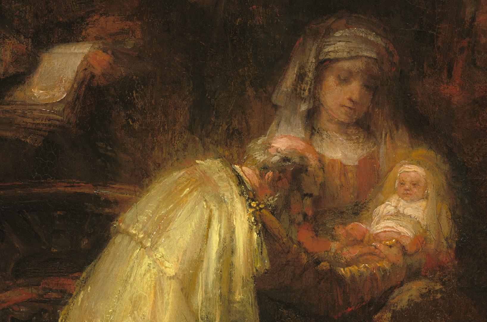 After learning the fundamentals of drawing and painting in his native Leiden, Rembrandt van Rijn went to Amsterdam in 1624 to study for six months with Pieter Lastman (1583–1633), a famous history painter. Upon completion of his training Rembrandt returned to Leiden. Around 1632 he moved to Amsterdam, quickly establishing himself as the town’s leading artist. He received many commissions for portraits and attracted a number of students who came to learn his method of painting. Only the Gospel of Luke, 2:15–22, mentions the circumcision of Christ: “the shepherds said one to another, Let us now go even unto Bethlehem…. And they came with haste, and found Mary and Joseph, and the babe lying in a manger…. And when eight days were accomplished for the circumcising of the child, his name was called Jesus.” This cursory reference to this significant event in the early childhood of Christ allowed artists throughout history wide latitude in the way they represented the circumcision. The predominant Dutch pictorial tradition was to depict the ceremony as occurring in the Temple, but in this beautifully evocative painting Rembrandt places the scene in front of the stable. In this innovative composition, Mary, rather than Joseph or another male figure, tenderly holds her son in her lap in front of the ladder of the stable, just as she will cradle his corpse some thirty-three years later near a ladder leaning against the cross. In this way Rembrandt suggests the fundamental association between the circumcision and Christ’s final shedding of blood at his Crucifixion. Onlookers crowd around the scribe who records the name of the Child in a large book. Iconographic, compositional, and documentary evidence all point strongly to Rembrandt‘s authorship. The fact that a dealer, who knew Rembrandt‘s work well and who was in the midst of complex financial arrangements with him, paid a substantial amount of money for this painting makes it virtually certain that The Circumcision was executed by the master himself. In a space almost entirely shrouded in shadow, light falls across a bearded man kneeling in front of a woman cradling an infant, as about a dozen people to our left look on in this horizontal painting. The people all appear to have light skin, though some are deep in shadow. The scene is painted with dabs and soft strokes of peanut and coffee brown, golden yellow, ivory, smoke gray, and muted terracotta red, so many of the details are indistinct. At the bottom center of the painting, the man, woman, and baby are small in scale, reaching less than halfway up the composition. The kneeling man wears a long, pale yellow robe that pools around his bent legs. Facing our right in profile, he has a fringe of gray hair around his balding head and a gray beard. He reaches out toward the baby resting along the woman’s lap. The man holds an instrument like a stylus at the baby’s groin, and the child’s legs are bare. The infant is wrapped in a white cloth over his head and torso, and gold-colored fabric drapes over his head and shoulders. With tiny, rounded features, the baby looks toward the man at his feet. The woman wears a long-sleeved, muted red dress with white fabric across her chest. She looks down, and her head is wrapped with a pale gray turban that falls to either side of her face and covers her hair. At the front of the group of men and women looking on, to our left, a bearded man wearing a brown turban, a waist-length dark gray cape, and a lighter gray robe writes in an open book slung over his forearm. Several people, most also wearing turbans in silver gray, ruby red, or terracotta brown look over the man’s shoulder. A few more people look down at the scene from the shadows above, near the upper left corner of the painting. Behind the woman and child, a ladder leans against a platform, perhaps a loft, and draped fabric creates a canopy over the woman. A jumble of objects there merge with the deep shadows. (NGA)