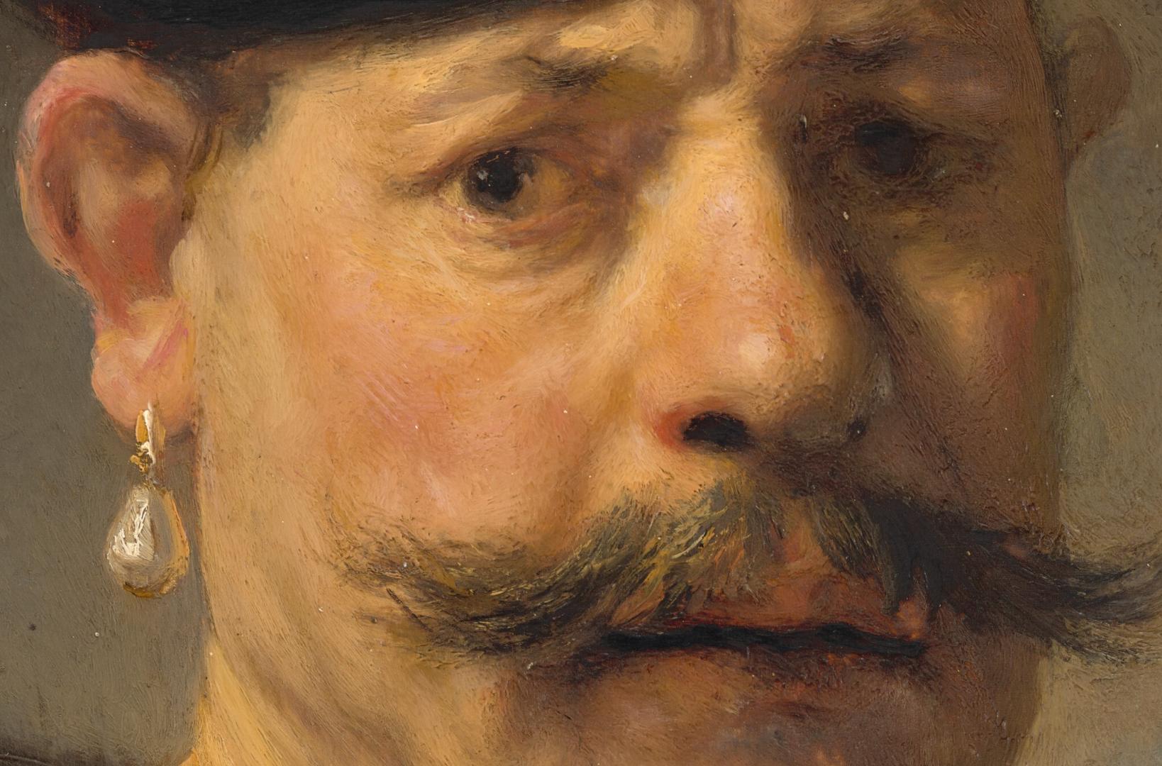 After learning the fundamentals of drawing and painting in his native Leiden, Rembrandt van Rijn went to Amsterdam in 1624 to study for six months with Pieter Lastman (1583–1633), a famous history painter. Upon completion of his training Rembrandt returned to Leiden. Around 1632 he moved to Amsterdam, quickly establishing himself as the town’s leading artist. He received many commissions for portraits and attracted a number of students who came to learn his method of painting. A Polish Nobleman is probably not a portrait of a specific individual; instead it represents a more generic exotic type that Rembrandt favored during the 1630s. The beaver hat, dark fur cloak, and massive gold chain and medallion have suggested to many that the sitter was Slavic, but the painting’s title has no factual basis. Such exotic paintings allowed Rembrandt to expand the limits of portraiture because he was not constrained by traditional conventions. Through dramatic accents of light and dark on the sitter’s face, bold brushwork, and dense application of paint, Rembrandt created a powerful, almost sculptural presence. By emphasizing the man’s furrowed brow and by shading his eyes, Rembrandt has portrayed him as a thoughtful individual. The penetrating expression of A Polish Nobleman and the striking resemblance of the sitter’s features to Rembrandt’s, particularly in the area around the eyes and nose, make one wonder if this painting is not, in fact, a fanciful and liberally embellished self-portrait. Shown from about the waist up, a light-skinned man with sagging jowls and a double chin wears a fur garment and hat, a large teardrop pearl earring, and gold chains in this vertical painting. In front of a cracked gray stone wall, the man’s body is angled to our right but he turns his face to look at us with brown eyes under a furrowed brow. He has a bulbous nose, and his lips are slightly parted under a wide, wispy mustache. His brown hair is mostly hidden under the tall dark brown fur hat, which is wrapped with a gold chain with a gold medallion at the front. The chestnut-brown fur coat looks especially fuzzy along the neckline, which is also encircled with a thick gold chain. A gold, crown-shaped pendant with a black brush hangs over his right shoulder, closer to us. He holds a gold-tipped cane with his right hand, his thumb extended along the cane. The artist signed and dated the work in the upper right corner, “Rembrandt f: 1637.” (NGA)