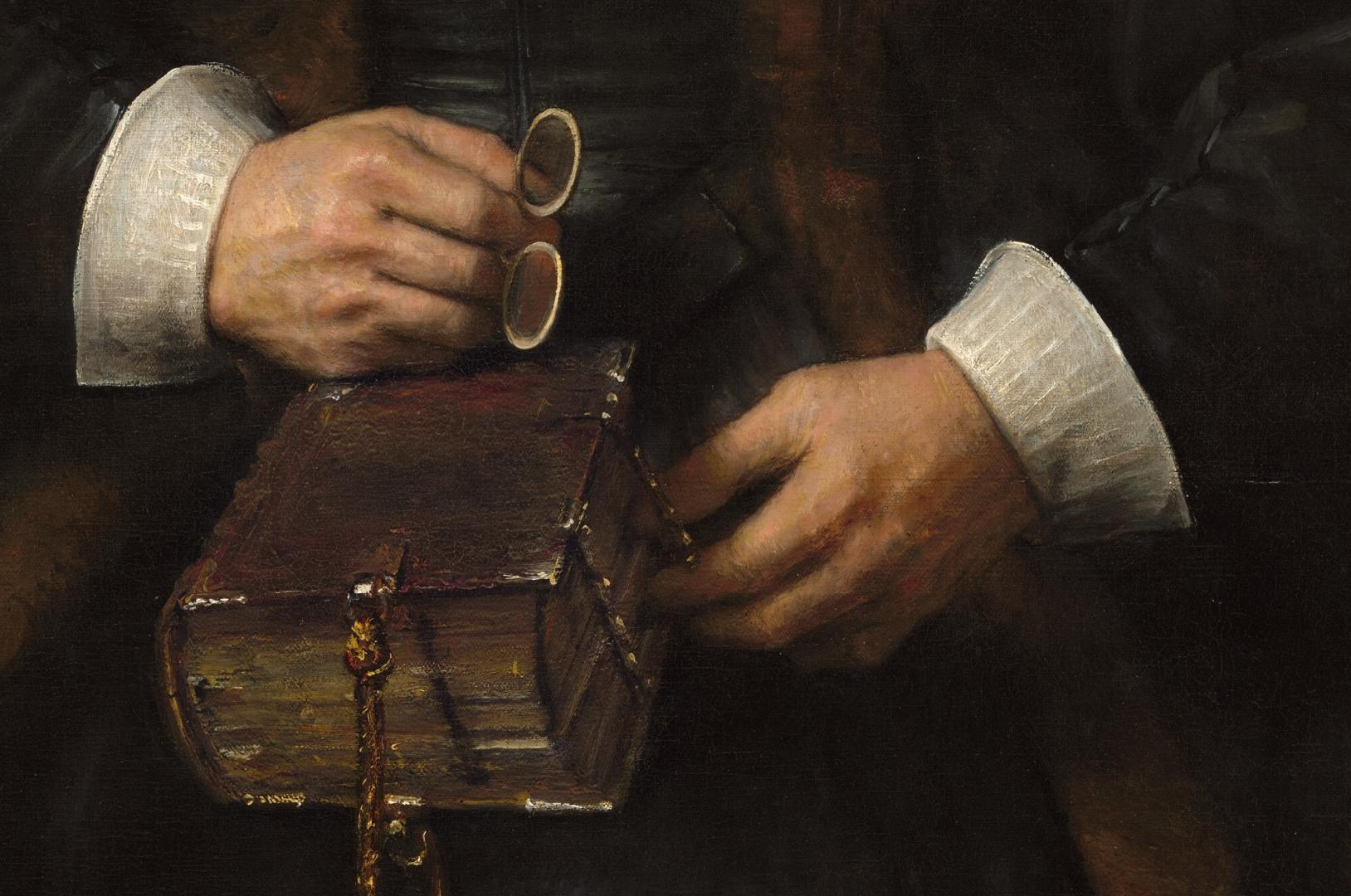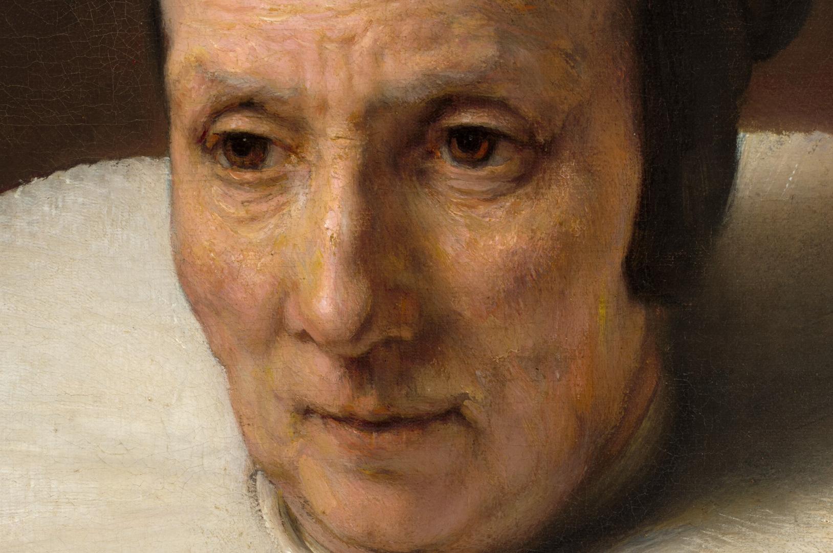 After learning the fundamentals of drawing and painting in his native Leiden, Rembrandt van Rijn went to Amsterdam in 1624 to study for six months with Pieter Lastman (1583–1633), a famous history painter. Upon completion of his training Rembrandt returned to Leiden. Around 1632 he moved to Amsterdam, quickly establishing himself as the town’s leading artist. He received many commissions for portraits and attracted a number of students who came to learn his method of painting. This woman’s reserved demeanor, her wide-wheel ruff collar, and the Bible in her lap all suggest that she was a conservative member of Dutch society and dedicated to her religious beliefs. The sitter does not communicate directly with the viewer through a gaze or gesture, but instead seems lost in her thoughts about the biblical text she has just read. Despite the inventiveness of the portrait concept and the painterly qualities evident in the face, it seems probable that Rembrandt relegated the costume, chair, and background to a studio assistant. A small but telling detail confirms that the collar was executed after the head was completely finished: a stroke of white paint overlaps the woman’s right cheek. Once Rembrandt had blocked in the form in his customary manner and painted the woman’s head and hands, he likely passed the unfinished canvas on to an assistant to be completed. Shown from the knees up, a pale-skinned woman wearing a black dress with white cuffs and a wide, starched collar sits in a wooden chair against a dark brown background in this vertical portrait painting. Her body faces us and she looks off to our left with brown eyes. She has slight jowls at her chin and her eyes, mouth, and forehead are lined. Her hair is pulled back under a close-fitting black cap. Extending straight from around her neck, her white collar is pleated into narrow figure-eights and nearly reaches her shoulders. She wears a brown stole over her velvety black dress, and both nearly blend with the dark background. She holds a pair of pince-nez spectacles in her right hand, which rests on a thick book in her lap. The spine faces her right, and the opposite edge is fastened with metal clasps. A braided cord affixed to the narrow end of the book near us creates a loop. (NGA)