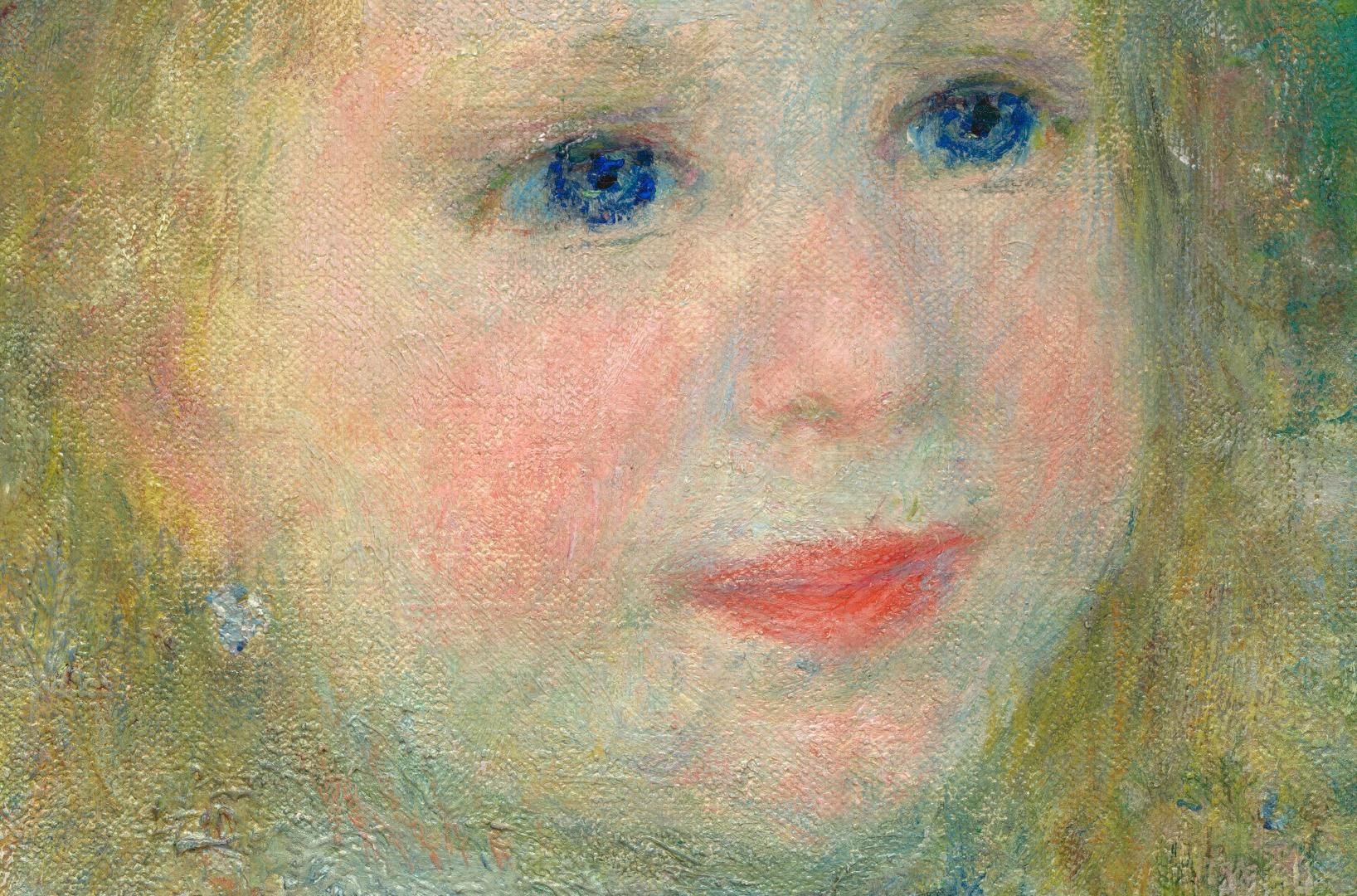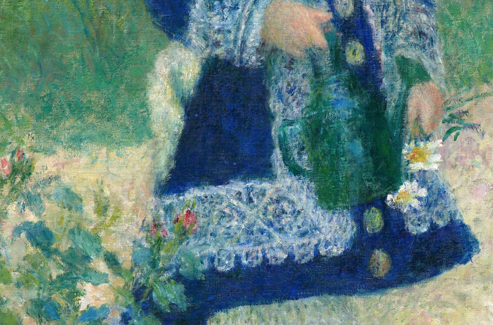 A pale-skinned young girl with blond hair, wearing a blue dress, stands in a garden in this vertical painting. The girl and background are painted with blended strokes, giving the scene and especially the girl a soft look. She faces our right and stands in the middle of the composition. Her shoulder-length cloud of hair is topped with a red bow, and long bangs frame her round face. Under faint brows, her sapphire-blue eyes look to our right. She has a petite nose, and her coral-pink mouth turns up in a slight smile. Her cobalt-blue dress is trimmed with wide, blue-white lace on the neckline, across the bottom hem, and down the front to either side of a row of white buttons. The white edges her petticoats come down to just below her knees, peeking out from under the flaring skirt. She wears white socks over blue ankle boots, which also have a row of white buttons down the side we can see. Her near hand is raised with her index finger hooked in the handle of a green watering can, and she holds two daisies by her side in her other hand. She stands on a path flecked with ivory white, pale purples, greens, and pink that curves up and to her left. A bush with emerald and pine-green leaves dotted with pink blooms fills the lower left corner. Behind her, green grass runs back to meet a profusion of pink, purple, and poppy-red plants and flowers that run along the top edge of the composition. The artist signed and dated the lower right, “Renoir. 76.” (NGA)