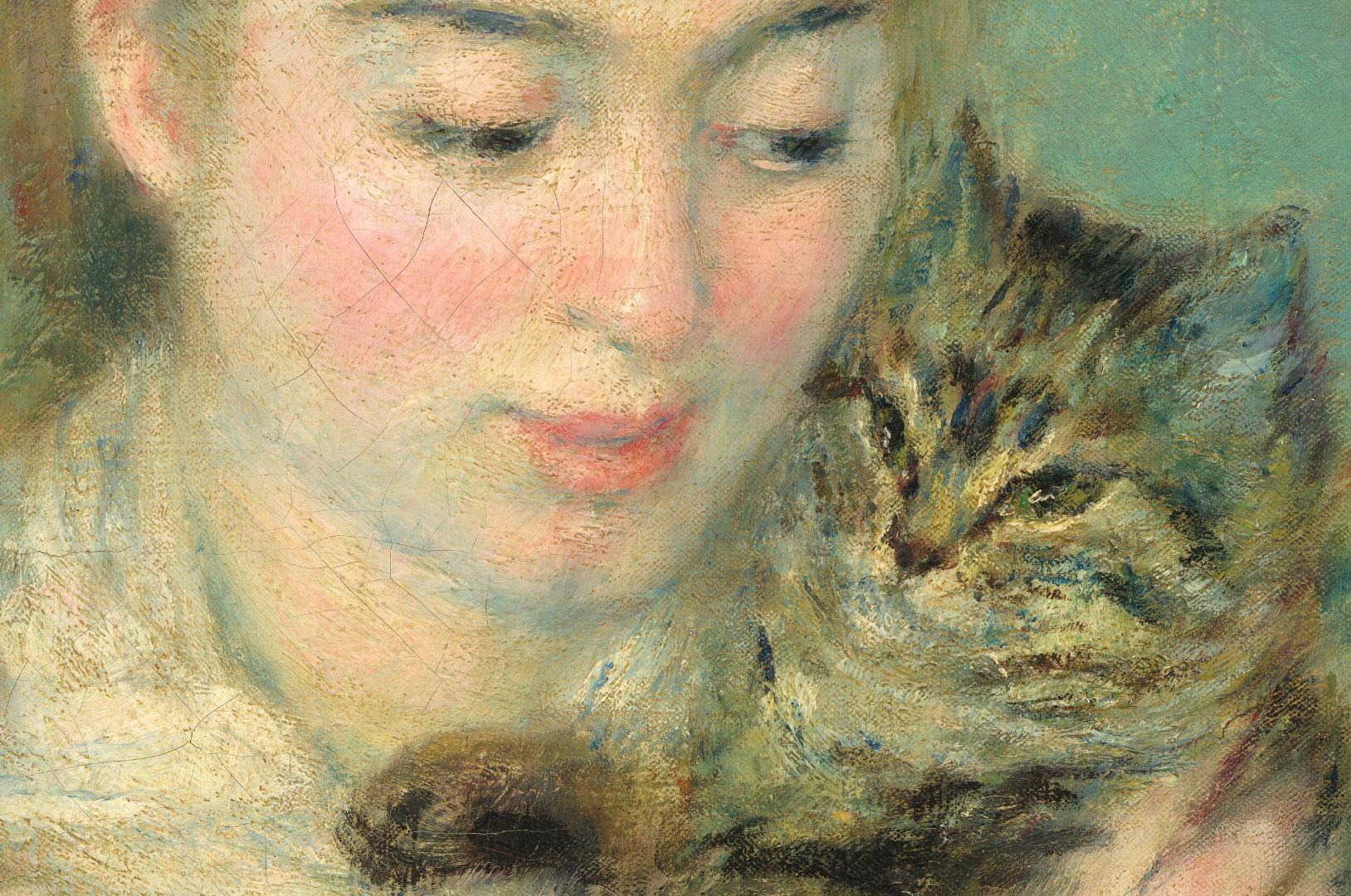 Shown from about the waist up, a young woman wearing white sits in an armchair cuddling a brown and black striped cat in this vertical painting. The scene is painted with blended brushstrokes, giving it a soft look. The wall behind them is seafoam green, and the edge of a yellow floral curtain lines the left edge of the canvas. The woman’s body is angled to our right and she looks at the cat with dark eyes. The woman’s light brown hair is pulled up, and her pale skin is accentuated by rosy cheeks. Her bare arms enfold the cat, held upright against the left side of her body so its head rests against her cheek. She supports the cat’s upper body with her right hand, on which she wears an emerald ring. The cat’s lower body nestles into the crook of the woman’s left arm. Its paws are extended and its head pulled back. The white and blue tones of the woman’s short-sleeved dress and kerchief tied around her neck contrast against the muted burgundy-red of the armchair behind her. To our right, behind the woman, vibrant, loose brushstrokes in red, orange, green, violet, and white could be a floral arrangement. (NGA)