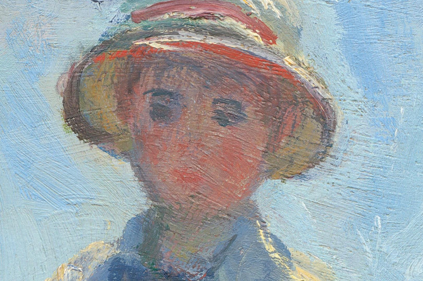The artist’s wife Camille stands on a hill with their son Jean behind her. Monet worked quickly to record this moment. Sketching the sky in chaotic strokes of blue and gray, he left areas of canvas exposed in his haste. The grass is more densely painted in short brushstrokes of green, blue, and brown. Small dabs of yellow suggest buttercups, and the color is reflected on Camille’s sleeve. The dense slashes of brilliant white on the back of her skirt and jacket catch the light. Completed in a single outdoor session, this is a celebration of color and light.