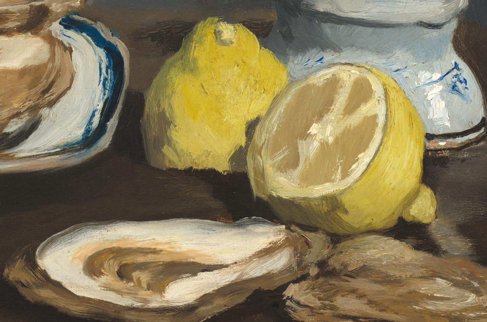 A plate of oysters, a halved lemon, an oyster fork and shells, and a dish of salt are arranged on a wooden tabletop in front of a gray wall in this horizontal still life painting. The front edge of the table seems close to us, and the objects span the width of this composition. Six oysters are crowded on the oval plate, which is white and edged with royal blue. The narrow tines of the oyster fork are angled toward the plate as the handle, which is shaped like the blade of a butter knife, angles to our right and seems to jut into our space. The two empty shells are next to the knife in front of the lemon, which has been cut in half through its girth. One cut edge faces our left and the other half rests with its cut edge down on the table. The bowl with salt mounded within is about the same size as the lemon and has a border of brown at the top and near the foot. The entire painting is loosely painted with visible brushstrokes, and some vague lines on the side of the bowl suggest a Japanese or Chinese character. (NGA)
