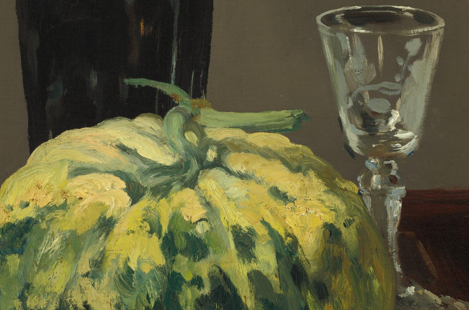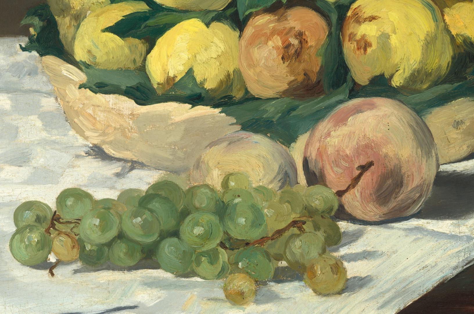 A white rose, grapes and other fruit, a squat gourd, a bottle, and a glass are arranged across a dark wood table partly covered by a white cloth in this horizontal still life painting. The table and its objects fill the width and most of the height of this composition, and are set against a sable-brown background. The rose, bowl, cluster of green grapes, and a peach sit on the shimmering, bright white cloth, which is draped over the left half of the table. The shallow, straw-yellow bowl holds a pile of canary-yellow pears and a few peaches nestled among green leaves. Another peach and a second piece of fruit sit in front of it, partly obscured by the grapes that lie near the front edge of the table. Continuing to the right, the pumpkin-shaped gourd, roughly the size of the bowl and its fruit, is painted with streaks and daubs of lemon yellow and light and forest green. It sits on a gleaming silver tray. A tapered, earth-brown bottle and a small glass with a long stem stand behind the gourd. On the front face of the table, near the lower right corner, a keyhole is outlined with gold, and the top of one table leg is also gold. The objects are loosely painted with some visible brushstrokes, especially in the fruit in the bowl and the gourd. The artist signed the lower right, “Manet.” (NGA)