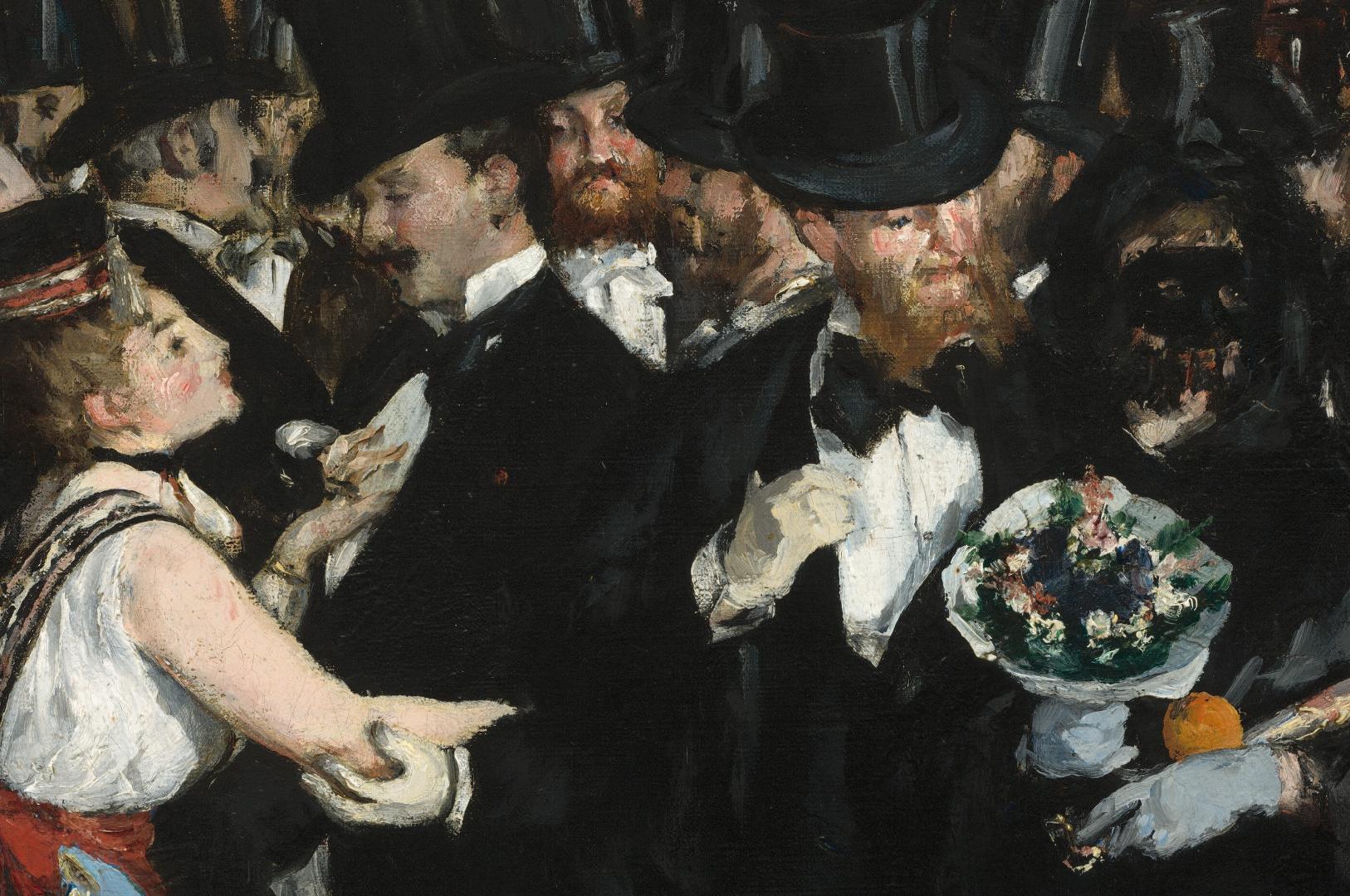 A densely packed crowd of men and women, all of them with pale skin and most of them wearing black, stand in a theater lobby beneath a mezzanine level that runs close to the top edge of the composition in this horizontal painting. Because the crowd spans the width of the composition, the first impression is of a mass of deep black stretching across the canvas. Slowly, individual faces and poses become evident. Five of the women wear black, oval masks that cover their eyes and noses, and one more mask has fallen onto the rust-red floor below. Two women, wearing bright white and colorful clothing, engage some of the men in conversation. A man cropped by the left edge of the painting wears the green, red, and gold costume and pointed cap of a court jester. Two gold and glass wall sconces hang on the cream-colored wall behind the crowd, one near each top corner. The space within the mezzanine level above is painted loosely so details are difficult to make out, but a pair of legs clad in black britches and white stockings seems to stand with ankles crossed at the top center. A leg wearing a red, high-heeled ankle boot dangles outside of the railing to the right. The brushstrokes are loose throughout. The artist’s signature appears on a piece of discarded paper on the floor near the lower right corner: “Manet.” (NGA)