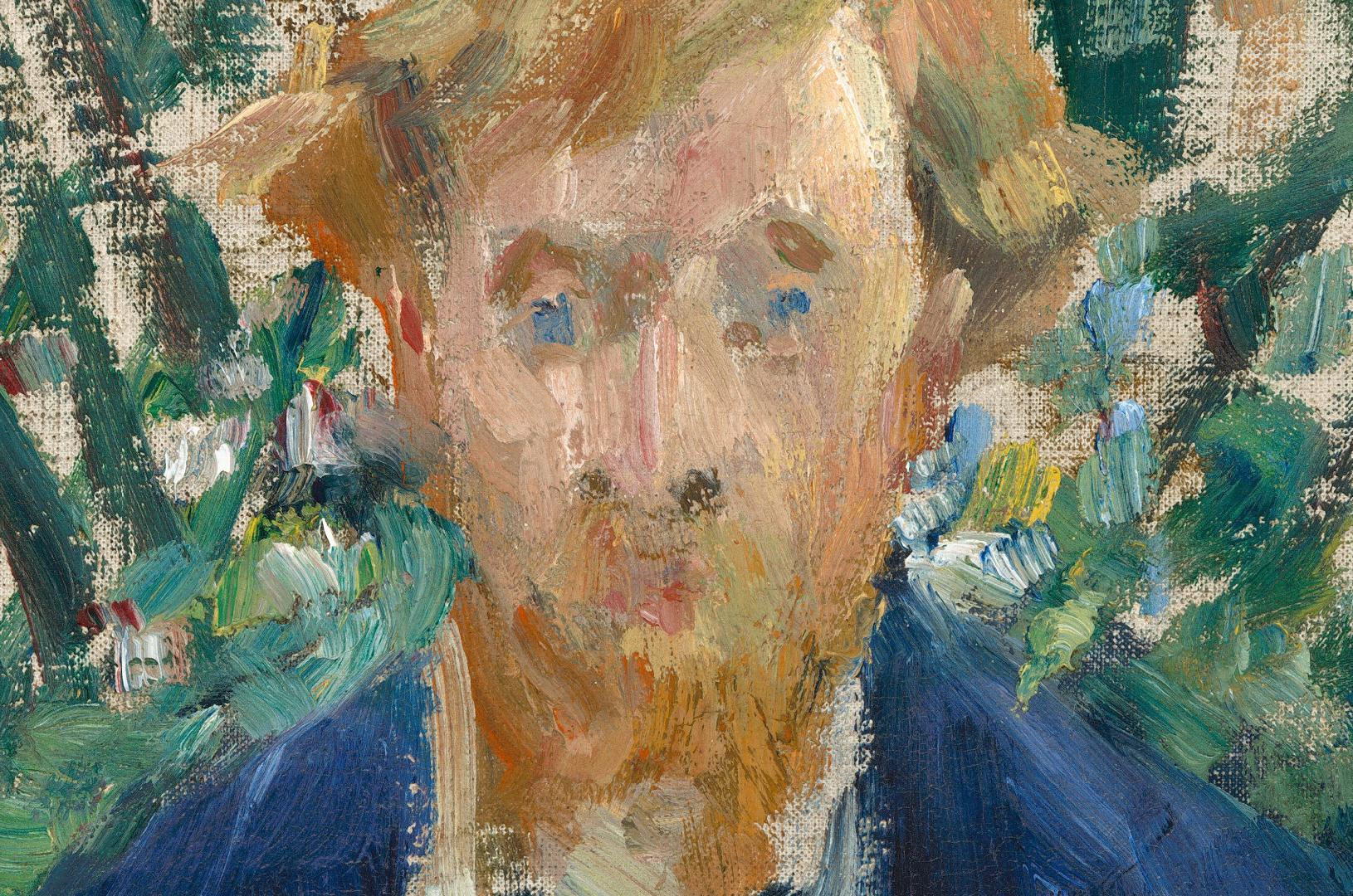 A pale-skinned young man with a carrot-red beard and hair faces us, straddling a green chair in a sunny outdoor setting in this vertical painting. The scene is loosely painted so his features are indistinct. His eyes are painted as pale blue dots, and he looks out at us. His chair unfolds into an X shape, with interlacing slats to make the seat. He leans forward to rest his hands on one side of the chair, and his legs are spread wide. He wears a marine-blue jacket over a white shirt, sage-green trousers streaked with gray, and black shoes. A soft blue V-shape at the neck suggests a neckerchief. Behind him, a half wall is topped by a trellis. The wall is painted in muted tones of pale laurel green while the trellis is painted with crisscrossed strokes of pine green. Daubs of emerald, pine, and forest green suggest vines and leaves, and flicks of orange, gold, and blue could be flowers. The ground beneath the man is pale peach scattered with thin scribbles and patches of fog blue. The painting is inscribed with “E 72.” in the lower right. (NGA)