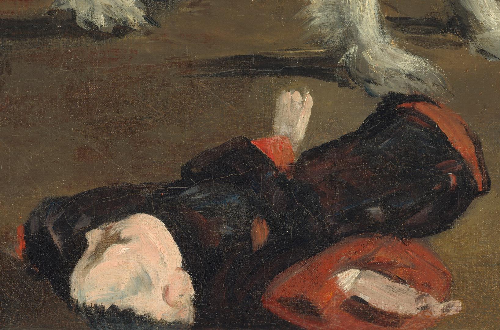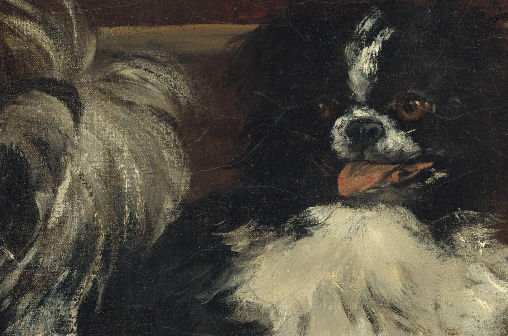 A small, shaggy, black and white dog stands in a wood paneled room with its body angled to our right but turning its head, pink tongue out, to our left in this vertical painting. The animal is painted with loose brushstrokes that evoke the dog’s long, feathery fur. The dog peers to our left with golden brown eyes. It is black along its flanks and ears, with a stripe of white down the center of the head, and on the muzzle. The chest, belly, and legs are also white, and the bushy tail, which curls up and out like a fountain, is a mixture of black and white. Leaning on the paneling behind the dog to our right is a light wood walking stick. An object, presumably a stuffed toy in the shape of a person wearing a long black robe lined in crimson, lies on the brownish sage-green floor in front of the dog. The dog’s name, “TAMA,” appears in tan block letters at the upper left. The artist signed the work in the lower right corner, “Manet.” (NGA)
