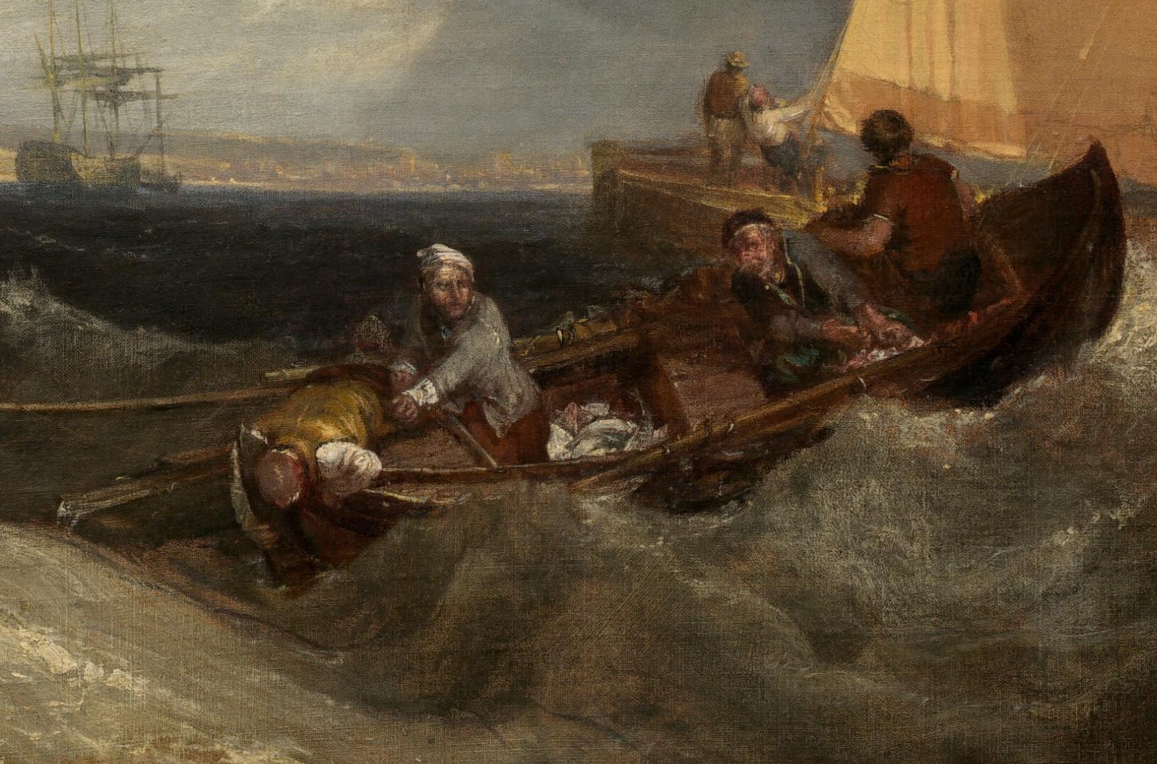 We look across churning waves at four sailing ships and a wooden rowboat with four men aboard in this horizontal painting. Dark, iron-gray and tawny-brown clouds approaching from the right fill the top two-thirds of the composition. The water closest to us roils with steel gray and tan, which deepens to charcoal gray as it recedes toward low hills in the distant background. In the lower left corner of the painting, a wooden container bobs in the waves, and a white bird flies low over the water nearby. Two ships to the left of center head directly toward us, leaning steeply to our left with their beige sails taut with wind. Two men, tiny in scale, stand on the deck of the ship to our left. To our right, two ships with butter-yellow and peach sails cut through the water. Three men stand on the deck of the ship in the front, pulling on the rigging. Closest to us and to the right of center, the rowboat crests a wave, tilting forward so we look into the long side of the boat and see the four men there. Near the stern, one man hangs over the side while another holds onto him. Two men sit to the right, one facing us while the other faces away. Sunlight streaks down through a break in the storm clouds to fall on a ship with furled sails in the distance at the center of the composition. This and two additional ships near the distant shoreline are silhouetted against bands of white clouds around blue sky, beyond the bank of dark gray clouds closer to us. (NGA)