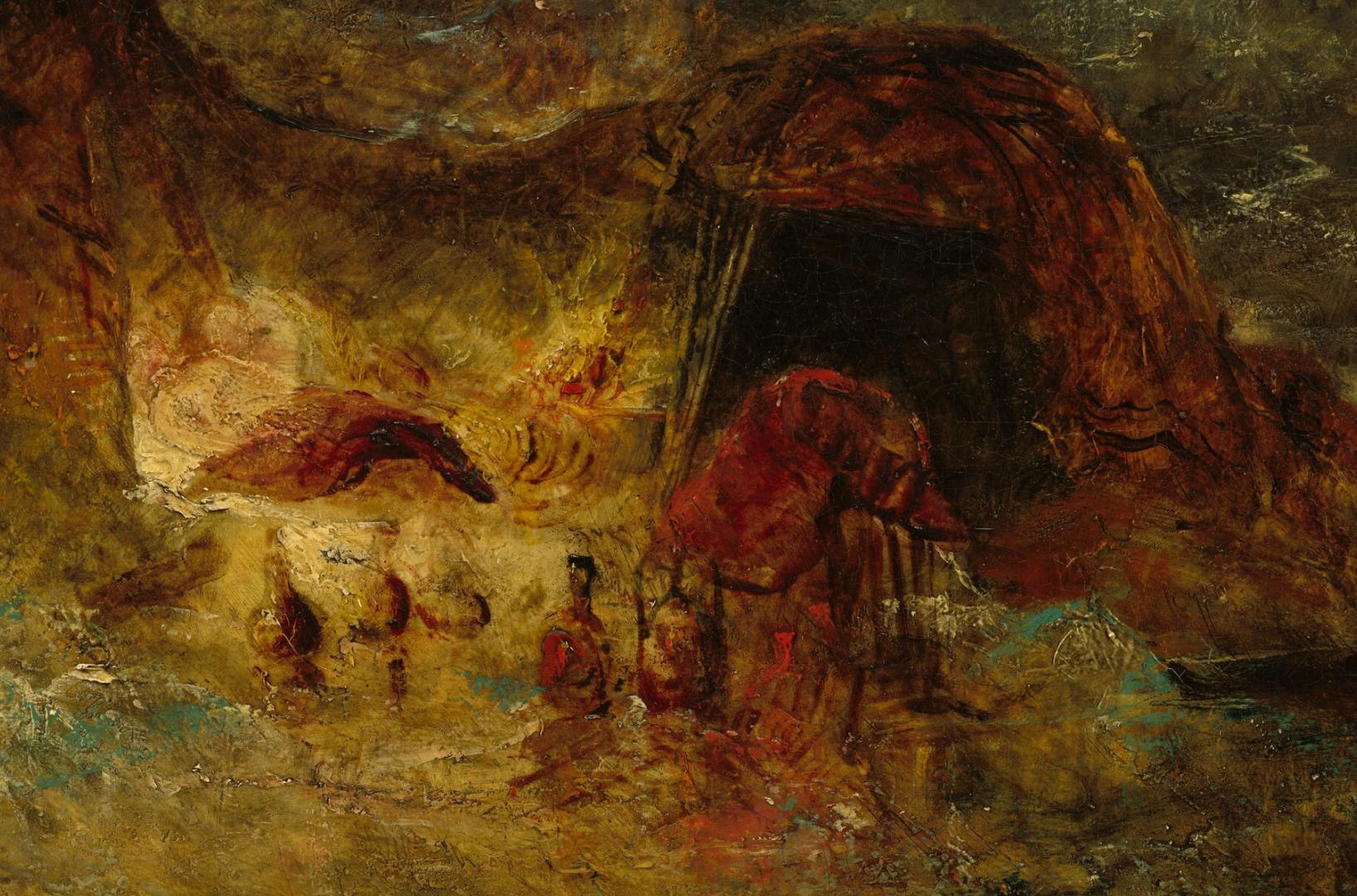A butter-yellow sky fills the top two-thirds of this square landscape painting while in the bottom third, a brown structure is surrounded by golden yellow and pine-green forms like clouds. The scene is loosely painted with visible brushstrokes, so much of the detail is indistinct, and the view seems hazy. Clouds spiral around the sun or moon, painted as a pale yellow disk, hanging in the center of the sky. The golden yellow clouds near the center darken to slate gray then rust brown, and nearly wine red along the top edge. A flock of birds painted as a dense band of navy and denim-blue Vs curve around the sun and continue into the deep distance. Below, touches of burgundy red and brown could indicate people or animals around the arched, copper-brown structure. Cloud-like puffs in forest green and golden yellow could be a forest or wildly crashing waves. A few faint outlines in this area suggest a bear, crocodile, giraffe, and maybe other ghostly creatures. (NGA)