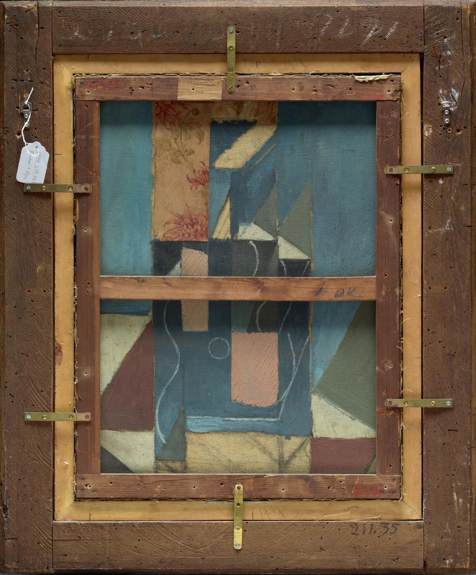 Juan Gris made significant contributions to the Cubist style established in 1910 by his friends Pablo Picasso and Georges Braque. The artist painted Guitar and Pipe in 1913, a pivotal year in his artistic development. In addition to adopting a more colorful palette, Gris developed an innovative system of overlapping strips, or bands, to structure his compositions. These bands, which offer shifting viewpoints of a greatly simplified guitar, pipe, and drinking glasses, are interspersed with flat patches of color and contrasting tonal passages. This collage-like appearance was undoubtedly inspired by the collage and papier collé (pasted paper) that Picasso and Braque introduced in their works of 1912. Gris heightened this effect by differentiating the techniques and textures of the various planes. The naturalistically rendered frame on the wall in the background serves as a foil for the artist’s daring new pictorial language of analysis and fragmentation. This painting was previously owned by two famous artists: Marcel Duchamp, a pioneer of the Dada movement, and George L. K. Morris, an American abstractionist. (DMA)