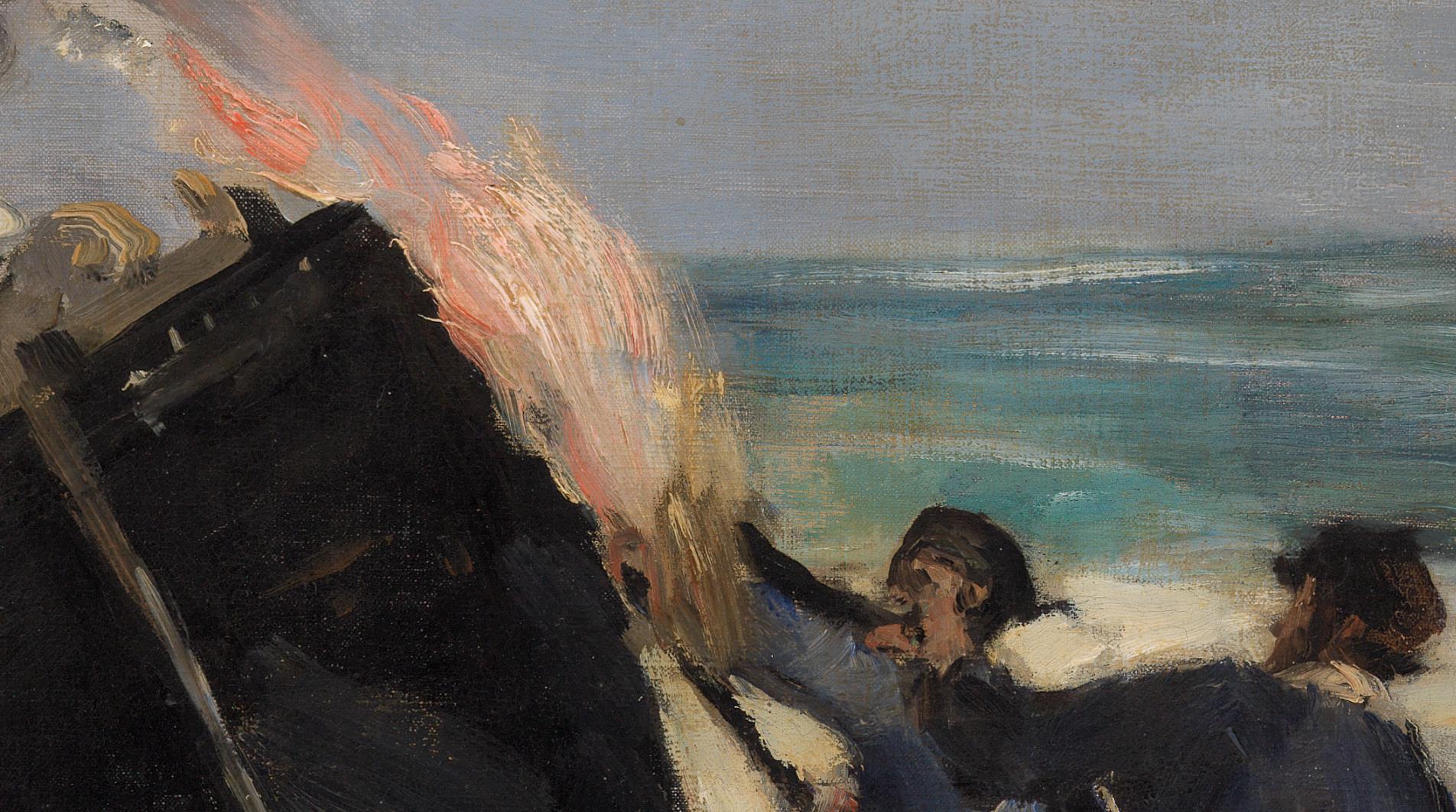 Édouard Manet painted this scene in 1873 while on a visit to Berck-sur-Mer, France, a fishing village on the Channel coast, with his family. Without a port to shelter their boats, fishermen in Berck beached their vessels in the sand along the water. Here, they are applying flaming tar to a boat to protect it from dampness while they are ashore. (Barnes)