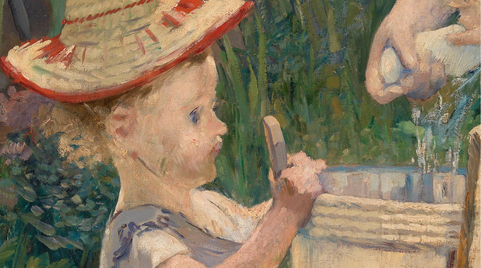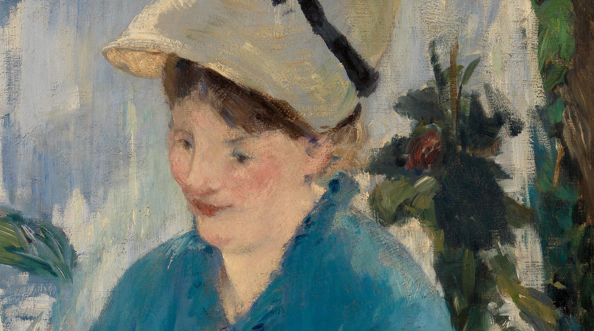 A woman washes linen in a flower-filled garden. A child to her right, as if eager to help, tugs at the pail of suds. Washerwomen were popular figures in 19th-century art and literature. Manet‘s good friend Émile Zola, for example, described their tough lives in his novels. But this depiction is idyllic. Flashes of white paint —offset by grays and blues—become sunlight on the drying fabric. After the jury of the French Salon, the annual state art exhibition, rejected this painting, Manet exhibited it independently. (Barnes)