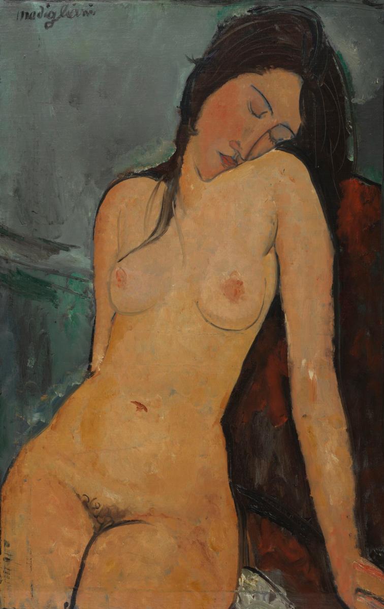 This is one of a series of celebrated female nudes which Modigliani painted in 1916 and 1917. His unusual and powerful depiction incorporates a wide range of artistic influences. For example, the woman’s elongated face relates to Egyptian, African and Oceanic sculpture, which he studied at the ethnographic museum in Paris. When a group Modigliani’s nudes were first shown at the Berthe Weill Gallery in Paris, police closed the exhibition, citing the depiction of pubic hair in some of the paintings as obscene. (Courtauld)