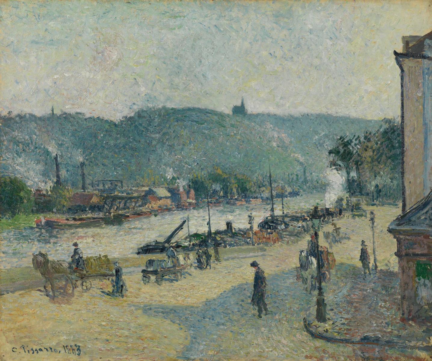 This is one of 17 paintings produced by Camille Pissarro in 1883, during his first visit to the northern French city of Rouen, which he declared to be as beautiful as Venice. Pissarro shunned the typical picturesque vistas offered from the surrounding hills, seen on the horizon. He was excited instead by the city’s industrial life, particularly the ‘workers on the quays, boats, smoke, mist in the distance’, which he captured here from the balcony of a café overlooking the Seine. Sunlight and shadow are conveyed in sharply hatched brushstrokes. (Courtauld)