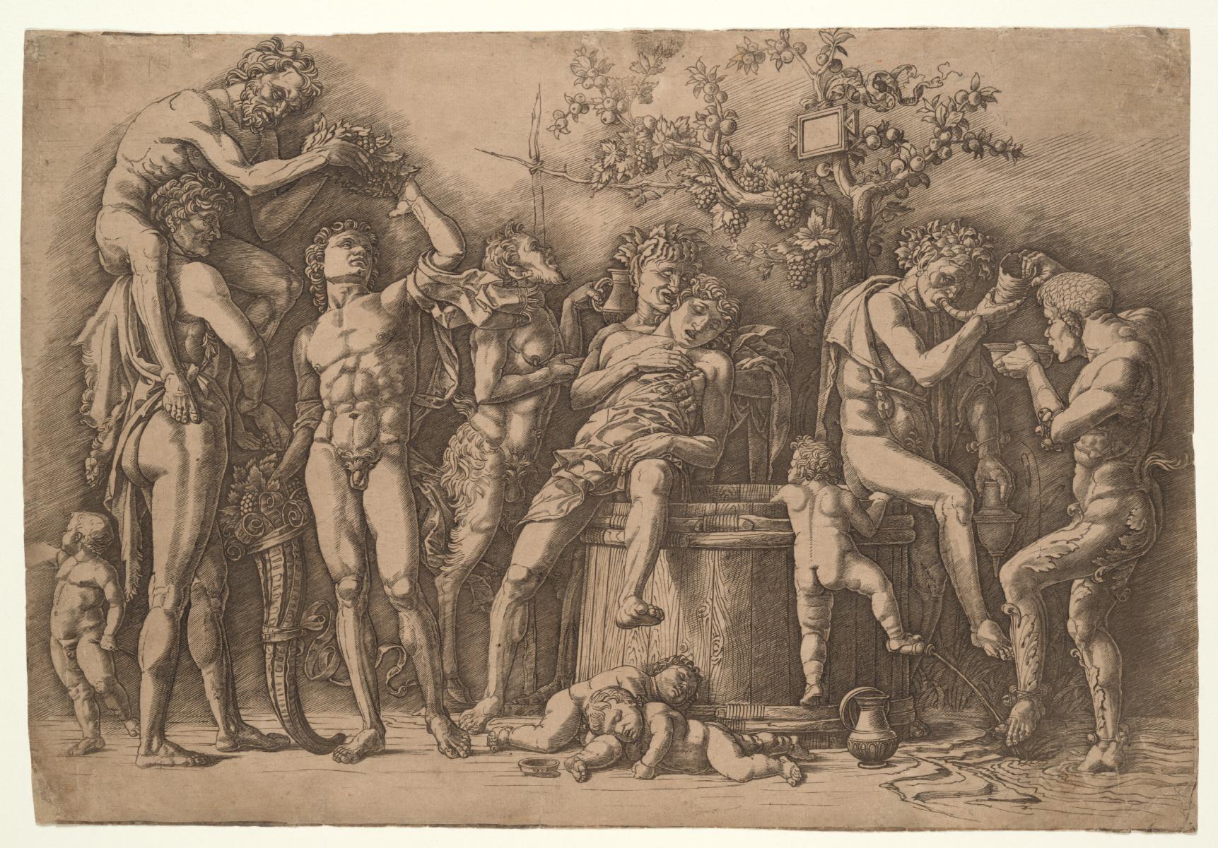 Here, the drunken figures gather around the wine vat populating the space with a funereal majesty. It conjures a deeper emotional content in the ancient associations between Bacchic rites and Christian mysteries. The unconscious youth at the center is held up by a gaunt mourning figure much like the dead Christ in the Pietà. Of all the possible interpretations of this print, it is most likely that Mantegna produced his engravings as a means of making his inventions widely known beyond his circle of patrons in Mantua. (MET)