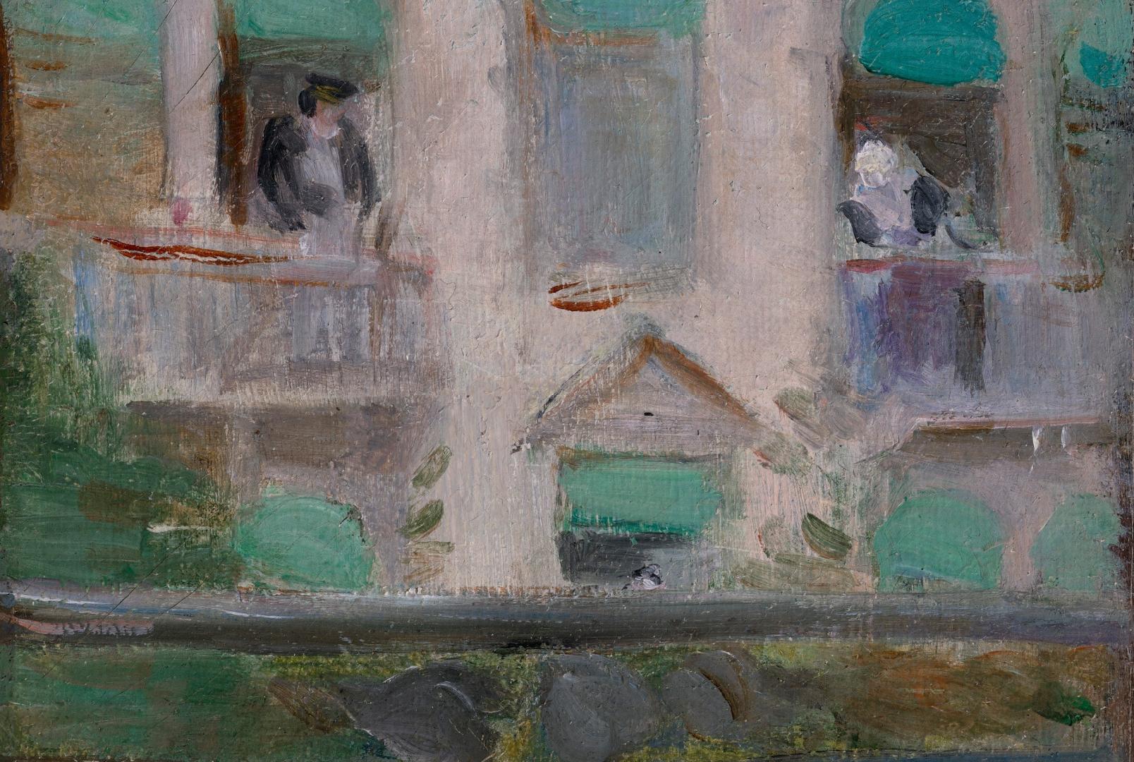 A young woman with pale peach skin and light brown hair sits in profile facing our left in an upholstered chair in this vertical painting. The chair and woman take up most of the composition so seems close to us. She wears a long-sleeved white dress that sweeps to the floor, with black ribbons around her neck and atop her shoulder-length ringlets. The dress has small ruffles at her throat and a deep flounce at the bottom. She gazes down at the partially open fan she holds on her lap. The fan is touched with spots of pumpkin orange, plum purple, and royal blue on a beige background. Loose, swirling brushstrokes in golden tan and bright white against an ivory background suggest that the chair is upholstered with a floral-patterned fabric. A wooden desk or table is pushed against the wall behind the woman to our right and to our left, a white door, covered by a white curtain, opens onto a balcony with a wrought iron railing. Across the street, a couple of people lean out of open windows covered by turquoise-blue awnings on a cream-colored building. (NGA)