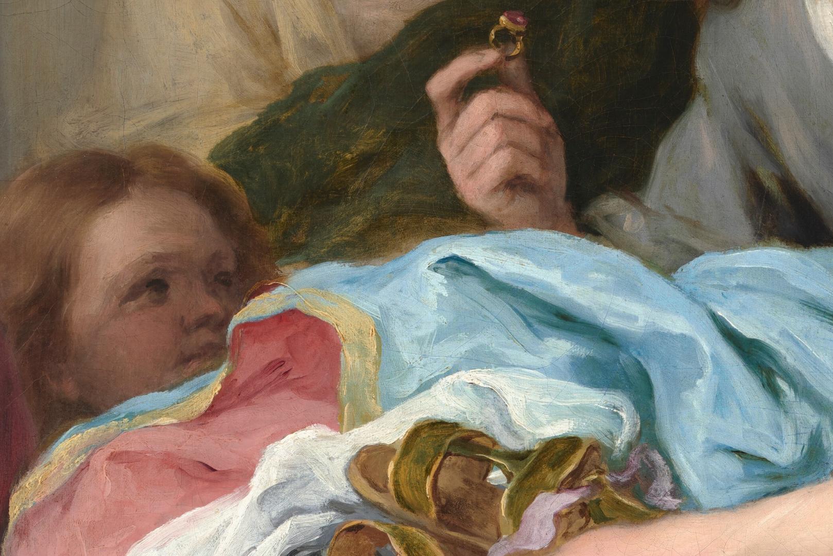 Murillo‘s great talent for dramatic painting is apparent in this monumental depiction of the familiar parable of the prodigal son, an allegory of repentance and divine forgiveness. With players and props effectively placed to underscore the drama, it is reminiscent of a well-staged theater piece. The artist selected the essential elements of the story’s climax: the penitent son welcomed home by his forgiving father; the rich garments and ring that signify the errant son’s restoration to his former position in the family; and the fatted calf being led to the slaughter for the celebratory banquet. The larger-than-life, central, pyramidal grouping of father and son dominates the picture, while the richest color is reserved for the servant bearing the new garments. Murillo may have chosen to emphasize that aspect of the parable — symbolic of charity — because of the nature of the commission. The Return of the Prodigal Son was one of eight huge canvases painted for the Church of the Hospital of Saint George in Seville, a hospice for the homeless and hungry. Murillo‘s model was the life around him; part of the appeal of this canvas lies in its human touches — the realism of the prodigal’s dirty feet, the puppy jumping up to greet his master, and perhaps most of all, the ingenuous smile of the little urchin leading the calf. A barefoot man wearing tattered clothing, with his hands clasped at his chest, kneels at the feet of an old, bearded man in this almost square painting. The pair is flanked by five people on our right and a man, boy, and calf on our left. All the people have pale skin. The kneeling man faces our right in profile and tilts his head up to look at the old man who embraces him. The younger man has shaggy, dark brown hair and a heavy five o’clock shadow. A small white dog jumps at his dirty, bare feet. The old man has a long gray beard and wears a black skullcap over gray hair. His voluminous dusty rose-pink cloak drapes over a teal-blue robe. To our right of the pair are a child, a woman, and three men. Some look at the embracing men while the others look at each other. At the front of that grouping, two men have brown hair and wispy mustaches. One wears a golden-yellow tunic and holds a silver tray piled with a shimmering sky-blue and pale pink garment, a bright white shirt, and a pair of sandals. Just beyond him and looking into his face, the second man wears gray with a dark green cloak draped over one shoulder. He holds up a gold ring with a ruby-red stone. To our left of the embracing men, a smiling blond boy leads the calf into the scene. Just beyond him is a thin, muscular man carrying an ax over one shoulder as he gazes down at the boy. The scene is set in a courtyard with walls that extend back on either side. Billowing putty-gray and white clouds fill the background. (NGA)