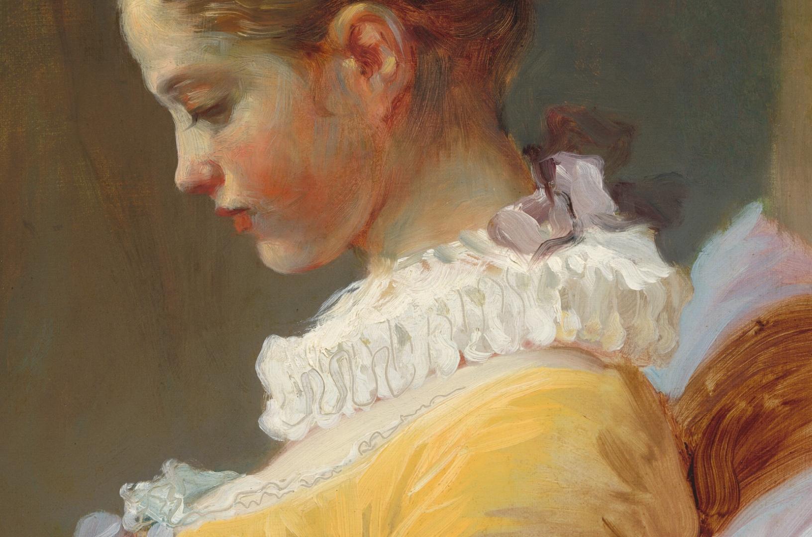 Fragonard’s brushwork is as much the subject of this painting as the young woman. A flurry of rapid marks captures her blushing face. Bold, fluid strokes of unblended color define her dress, ribbons, and cushion. Fragonard created the lace of her ruff (the frill around her neck) and the bodice of her dress by dragging his brush handle through the paint while it was still wet. Young Girl Reading is part of the “fantasy portrait” series, in which Fragonard’s friends and patrons are dressed in elaborate costumes. He supposedly painted each portrait in an hour. Like the others in the series, the girl in this painting originally faced the viewer, but Fragonard later repainted her absorbed in reading. (NGA)