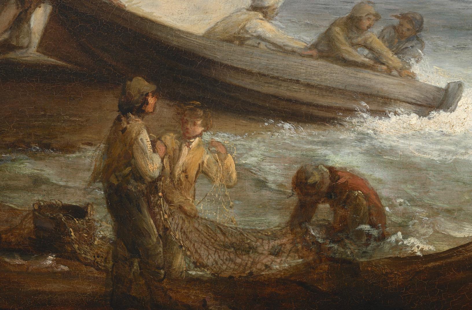 Gainsborough‘s landscapes are highly personal statements that evolved from ideas and images he developed in his studio, either directly on canvas or in scale models. In this work he focused on the physical exertions of fishermen as they confront strong winds and pounding surf. Even the massive cliff on the far side of the cove, its thrusting diagonal posed against the wind, seems to echo the efforts of the men struggling to launch their boat into the waves. Gainsborough owned works by Dutch marine painters, and their influence is evident here. His own free and suggestive painting technique, however, gives the scene a unique degree of freshness and spontaneity. He applied his paint in thin, translucent layers that are accented by deft touches of impasto, particularly in the fishermen’s clothing and on the white foam of the waves. A restrained palette of browns and creams suggests the shore and rocks; gray-greens, gray-blues, and white highlights describe the sun-filled expanse of the sea, while the sky is colored with delicate hints of purple, blue, and pink. From a rocky shoreline, we look on several light-skinned people working by the sea with a boat and a net in this freely painted, almost square seascape. The scene is framed by a silhouette of low boulders along the lower right corner, and a towering cream-white rock rising two-thirds of the way up the composition to our left. Scrubby, celery-green vegetation grows on the rocky outcropping. Near the center, close to the towering white rocks, three people sit, reaching for something near one end of a boat while a fourth person braces against the rock, presumably to push the boat out to the sea. Closer to us, three people on the shore work with a net. Two stand with the net hooked over their shoulders, and a third person crouches in the water with head down. The people all wear simple shirts and pants in shades of tan, mustard yellow, burnt orange, and pale blue. All but two wear hats. The sea meets the shore with frothy white foam and cresting, low waves. The sea beyond fades from pale sage green to arctic blue along the horizon, which comes about a third of the way up the composition. Two sail boats tilt against the wind in the distance. Pale, smoky lavender-purple clouds drift across the ice-blue sky. (NGA)