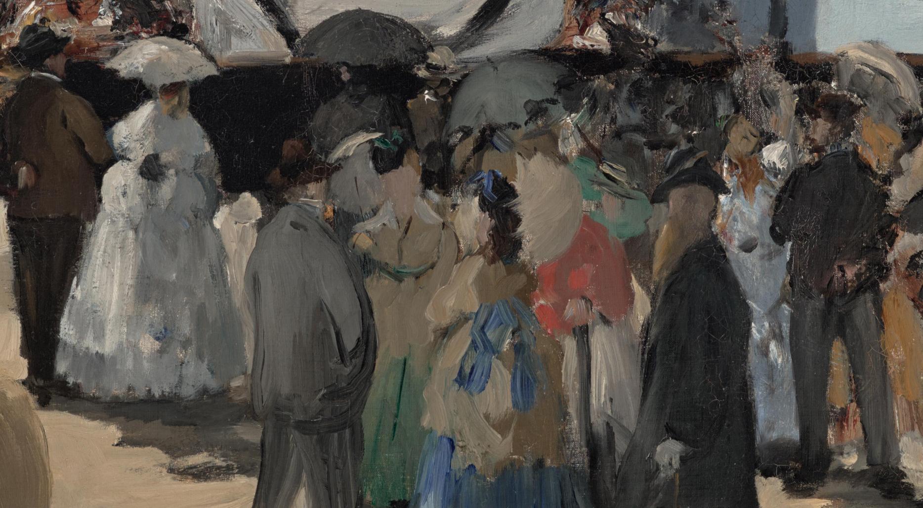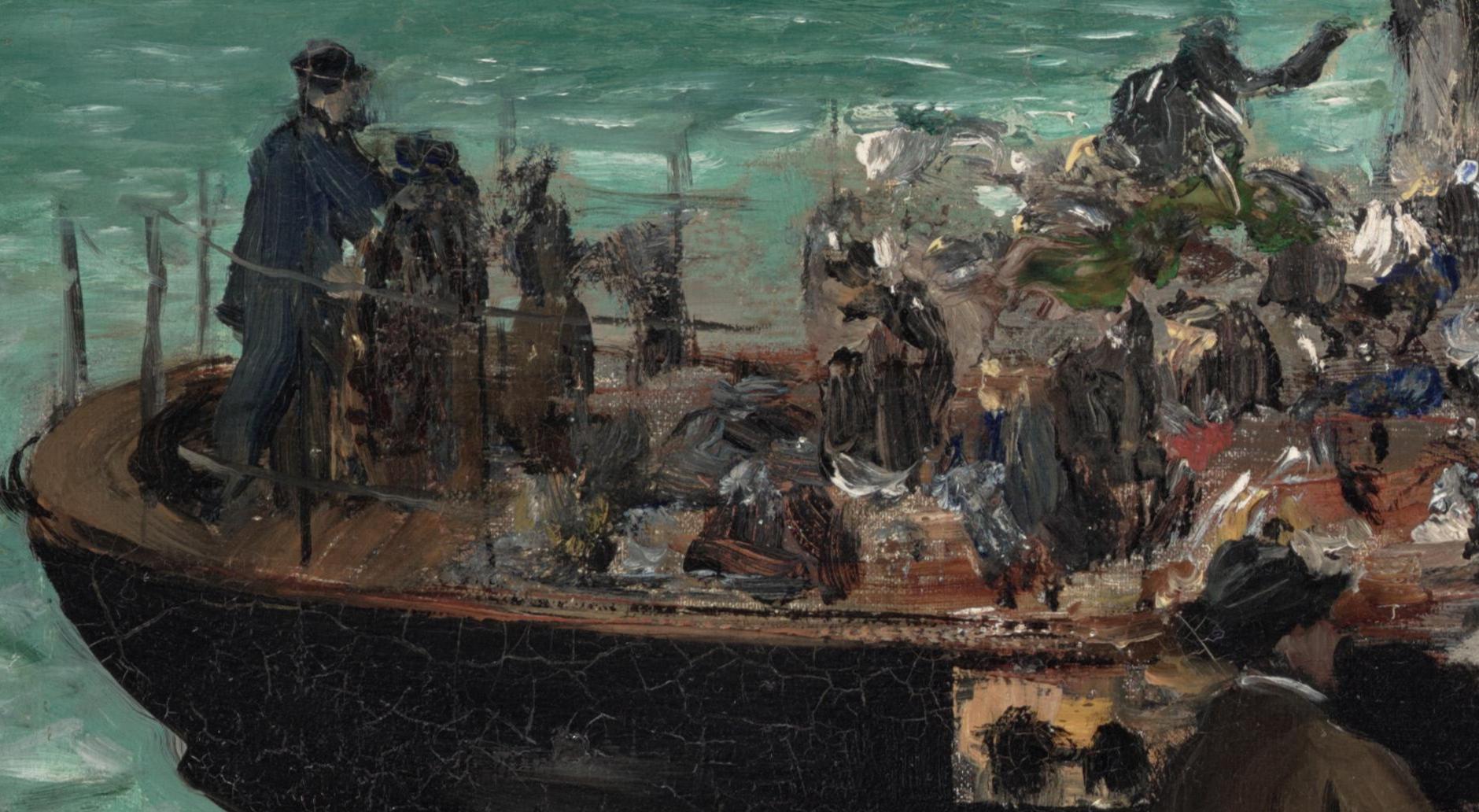 This image of the steam ferry that carried passengers from Boulogne to Folkestone, on the Channel coast in England, is one of two paintings that Manet made of the subject. The painting conveys the bustle and excitement of international travel in the early days of the steamboat’s operation. Manet employed thick and sometimes choppy brushstrokes to provide a sense of the enormous visual interest the scene held for him. His signature on this painting indicates that he considered it complete, despite its lack of incidental detail. (PhAM)