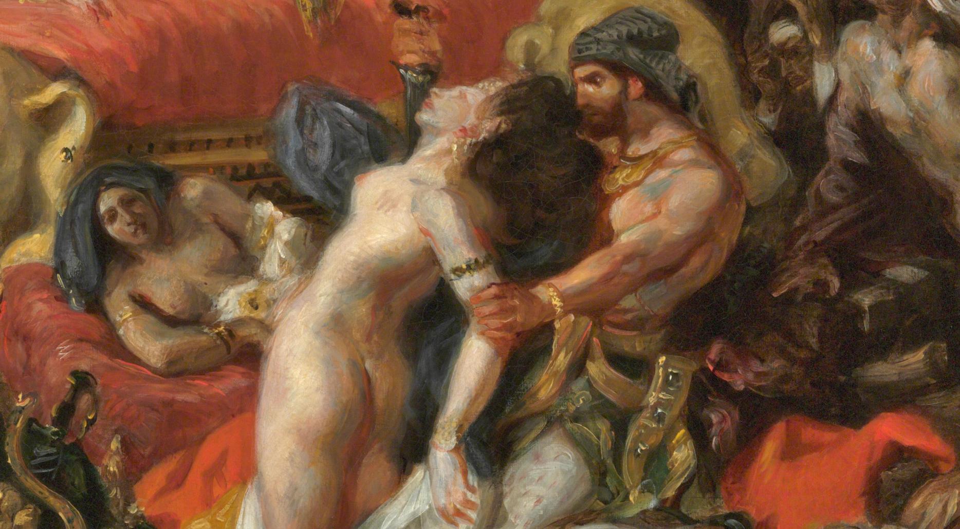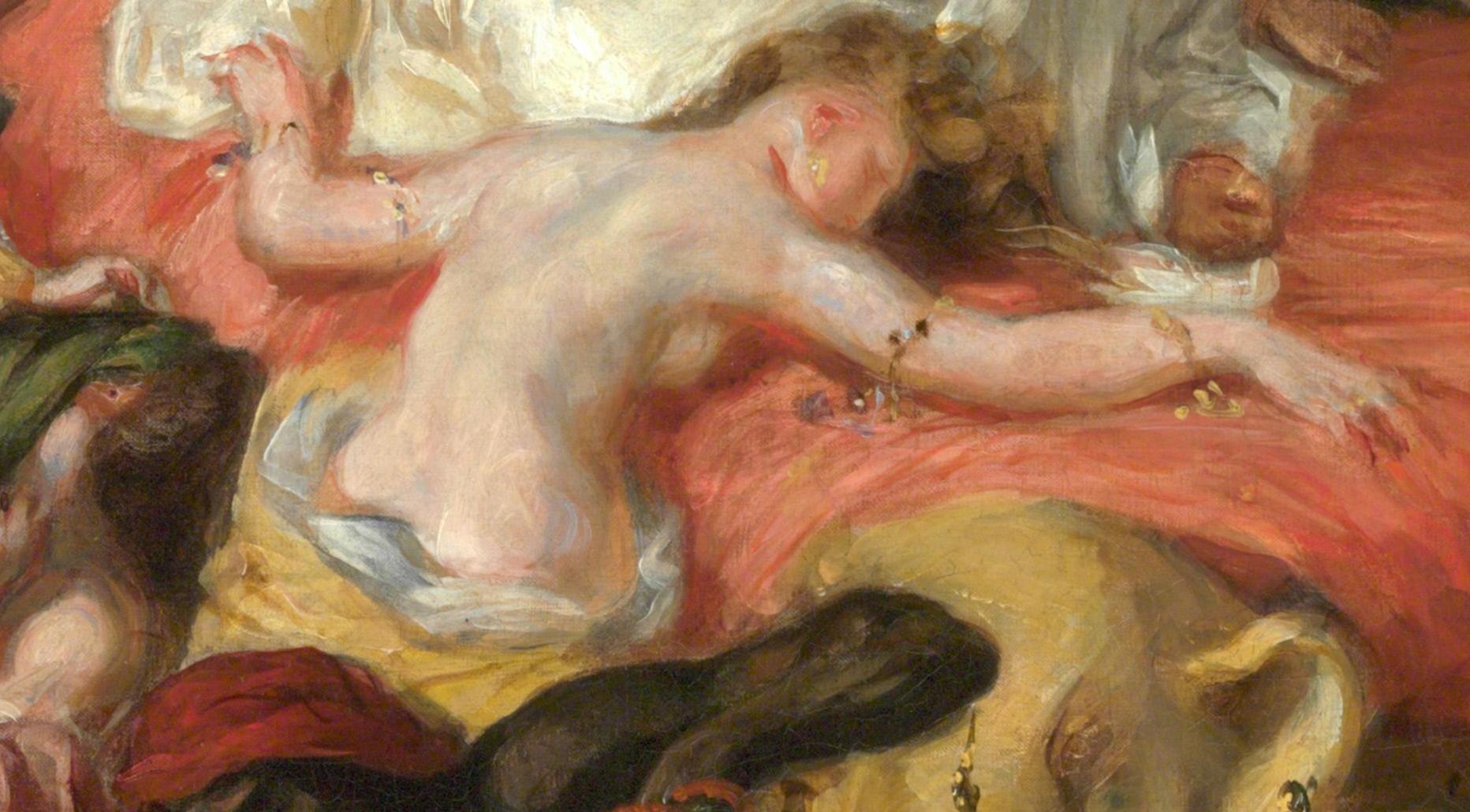 The subject of this painting was inspired by Lord Byron‘s dramatic poem of 1821 about the life of an ancient Assyrian king named Sardanapalus. Finding his palace besieged by enemies, Sardanapalus decides to kill himself, but first orders his officers to destroy all his favorite possessions in his presence—his wives, pages, and even his horses and dogs. This painting is a replica of a much larger work, now in the Musée du Louvre, Paris, that Delacroix first exhibited in the Salon of 1827–28, where it received harsh criticism. Delacroix may have painted this Museum‘s version for himself before selling the larger work in 1846. (PhAM)