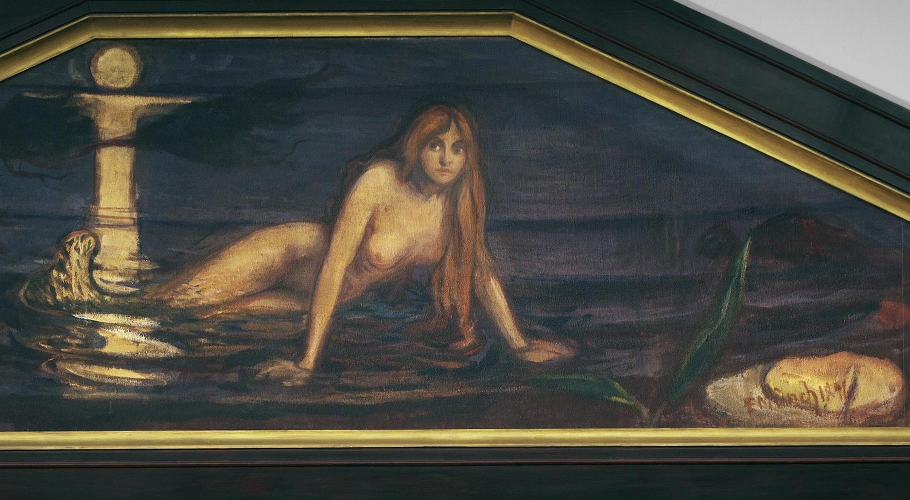 Edvard Munch painted Mermaid during an extended stay in Paris in 1896–97, upon receiving a commission for a large-scale decorative work from Axel Heiberg, a Norwegian industrialist. This striking image of a mermaid in the process of transforming into a woman reflects the artist’s interest in Symbolism (an artistic and literary movement aimed at eliciting emotional responses from the viewer or reader) and in the themes of metamorphosis, desire, and anxiety. Munch devised the picture’s unique trapezoidal format in response to Heiberg’s intention to hang the mural just below the sloping rafters of a stair hall in his home in Lysaker, Norway. (PhAM)