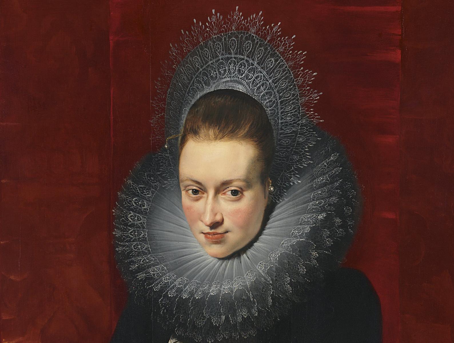 In the present panel the artist replaced the architectural backgrounds with balustrades and terraces used in his Genoese portraits with a warm red hanging, against which he locates a young woman who is richly dressed and holds a rosary. The costly, elegant nature of her clothes has led to the suggestion that she was an aristocratic member of the court at Brussels. However, it should be noted that in another important portrait, that of The Artist with Isabella Brandt (Alte Pinakothek, Munich), executed around the time of his marriage, Rubens depicted his wife, who was a member of the prosperous Antwerp middle classes, in equally fine clothes. The different effects and textures of the lace ruff, sleeves and headdress, the silver tones of the bodice with its gold embroidery, the gradations on the black dress and the reflections on the glass rosary, all recall the style of his portraits of Genoese aristocrats.