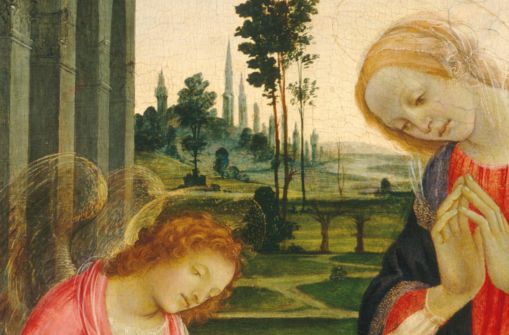 A winged angel, a woman, and a baby are gathered on a terrace that overlooks a softly lit landscape in this vertical painting. The people all have parchment-white skin tinged faintly with green, delicate gold halos, and they are close to us. The baby is round and plump, and faces us as he lies on his side on a carpet of pine-green grass dotted with small white and pink flowers. A band of caramel brown spans the lower edge of the painting. Propped up on one elbow, the baby turns his blond head to look at the woman kneeling beside him to our right. The woman, Mary, towers over the baby with her body angled slightly to our left. A midnight-blue cloak trimmed in gold is wrapped around her coral-red gown. The fingertips of her raised hands lightly touch as she bows her head and lowers her brown eyes to look at the child. A transparent white veil drapes over her blond hair. To our left, the angel also kneels and looks down at the baby with arms crossed over the chest. The angel has curly, copper-red hair and wears a carnation-pink robe over a transparent chemise. Semi-transparent, bronze-colored wings nearly disappear into the background. Just beyond the trio, a low balustrade with an opening near Mary encloses the space. A colonnade with arched openings extends into the distance to our left, behind the angel. A flat, olive-green wall rises the height of the painting behind Mary. Between them, the landscape is carpeted with moss and celery-green grass, and dotted with trees. A river winds toward slate-gray hills in the deep distance. (NGA)