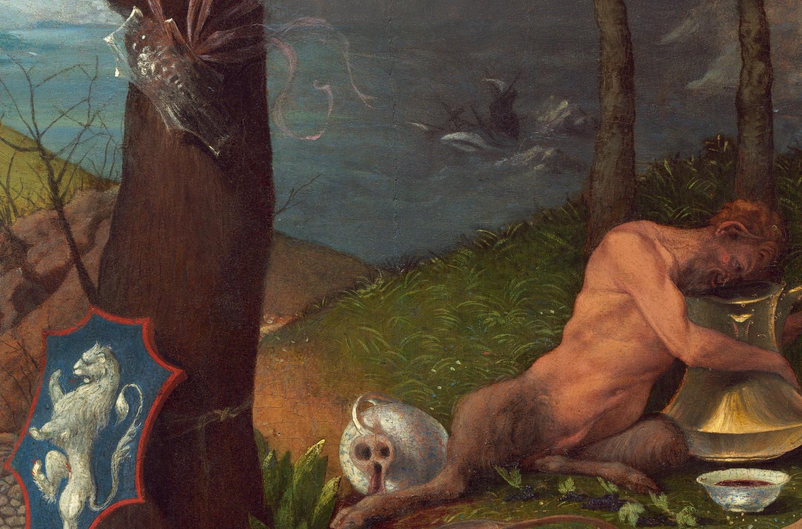 Set on a strip of land under a cloud-filled sky and in front of a stormy sea, a nude, swarthy complected satyr with a man’s body and shaggy, goat’s legs reclines to our right as a nude, pale-skinned, blond child crouches over some objects on the dirt ground to our left in this vertical landscape painting. The satyr leans over and peers into a golden urn, which has a round bottom and tall, flaring sides about the height of his torso. One hand holds the single handle and the other wraps around the body of the urn. The tips of the satyr’s ears are elongated and pointed, and the corner of his mouth curves up into an exaggerated smile in his brown beard. Red liquid pours from an object, perhaps an overturned urn, near the satyr’s outstretched leg and white liquid pours from another urn between us and the satyr. Next to the satyr, at the center of the painting, a thick, upright tree trunk is broken off abruptly but one shoot grows tall with emerald-green leaves. A translucent, shield-shaped object decorated with an open-mouthed, human face hangs from a pink ribbon around the broken trunk near the branch. A second shield outlined in red with a rearing, white lion against a royal-blue field leans against the foot of the tree to our left. Nearby, the pale, naked child holds a pair of sticks, possibly a compass, and reaches for other objects on the ground near the shield, including a white disk, a pair of small, red-covered books, a square and possibly a plumb line, a flute, pan pipes, and a scroll of paper. The ground and landscape around each person are distinctly different. To our left, the dirt ground under the child is littered with small rocks. Beyond a row of larger boulders, a sweeping field of lemon-lime green sweeps up into a bank of clouds. A small nude person with dark forms, perhaps representing wings, on their shoulders, arms hips, and ankles ascends a path up toward the clouds. To our right, the satyr reclines on green grass in front of a screen of three lush trees. Beyond, across the entire landscape, a choppy sea extends into the far distance beneath the steel-gray clouds above. A masted ship is swallowed by waves behind the satyr, to our right. (NGA)