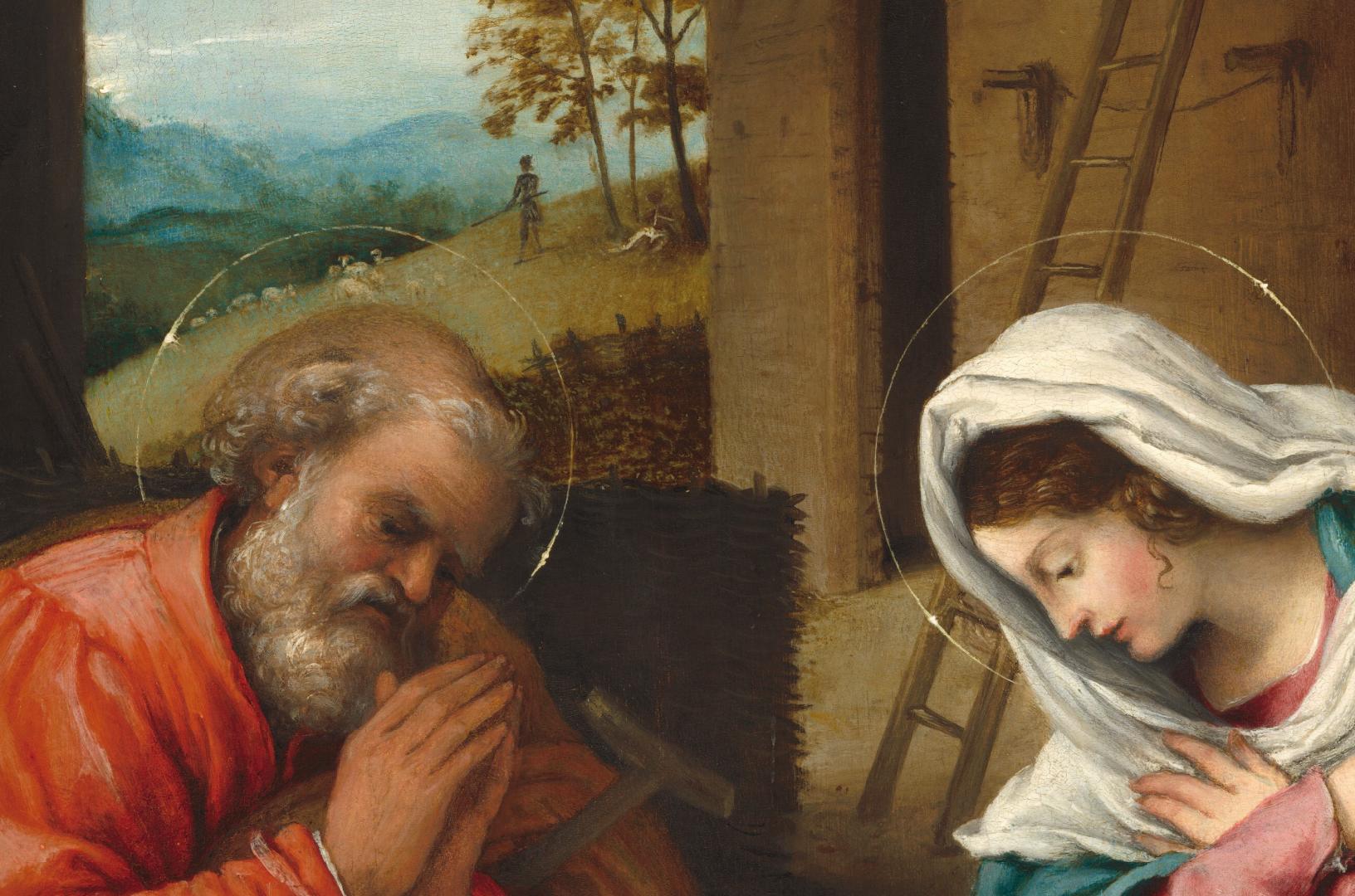 A young woman and an older man kneel to either side of a nude baby outside of a barn-like structure in this vertical painting. The people and three winged angels overhead all have pale skin except the older man, who has a more tan complexion. To our right, the woman kneels with her hands crossed over her chest, facing our left in profile. She looks down with dark eyes, and has a long, straight nose, flushed cheeks, and pink lips. Her wavy, chestnut-brown hair is mostly covered by a voluminous white veil that drapes across her shoulders. She wears an azure-blue cloak over a rose-pink, long-sleeved dress, which puddles under her knees. To our left, the man kneels with his hands held up near his face in prayer. He has dark eyes and a short, stubby nose. He is balding with a fringe of curly gray hair, and he has a full, graying beard. He wears a coral-red robe wrapped in a mustard-yellow cloak. The edges of white cuffs are visible at his wrists. One sandaled foot peeks out from under his robe as he kneels on the other knee. A walking stick lies across one arm, braced in his lap. Glimmering gold rings create halos around the man and woman’s heads. Between them and on a white cloth in a woven basket, the baby has a pudgy face and body as he lifts his hands toward the woman. One foot is also raised, chubby knee bent. The infant has dark eyes and blond curly hair. Clusters of three lines emanate from the top of his head and to the sides over each ear. A wooden container and a white sack sit on the dirt ground, next to the basket. Beyond the group is a wooden structure with a thatched, overhanging roof. Two white birds sit along a branch tucked in the supports holding up the roof, and a ladder leans against the side of the barn. A crucifux hangs from a deeply shadowed wall behind the man, along the left edge of the painting. Three, winged, childlike angels gather around a piece of sheet music at the top center of the painting. They all have dark blond hair but different colored wings, in coral pink, forest green, or golden yellow. Below, trees and grassy hills lead back to hazy blue mountains along the horizon in the deep distance. A person and white sheep dot the hillside near the structure. The sky above deepens from ice blue at the horizon to aquamarine blue across the top edge. The artist signed and dated the painting as if he had inscribed a plank of wood near the lower right corner: “L. Lotus 1523.” (NGA)
