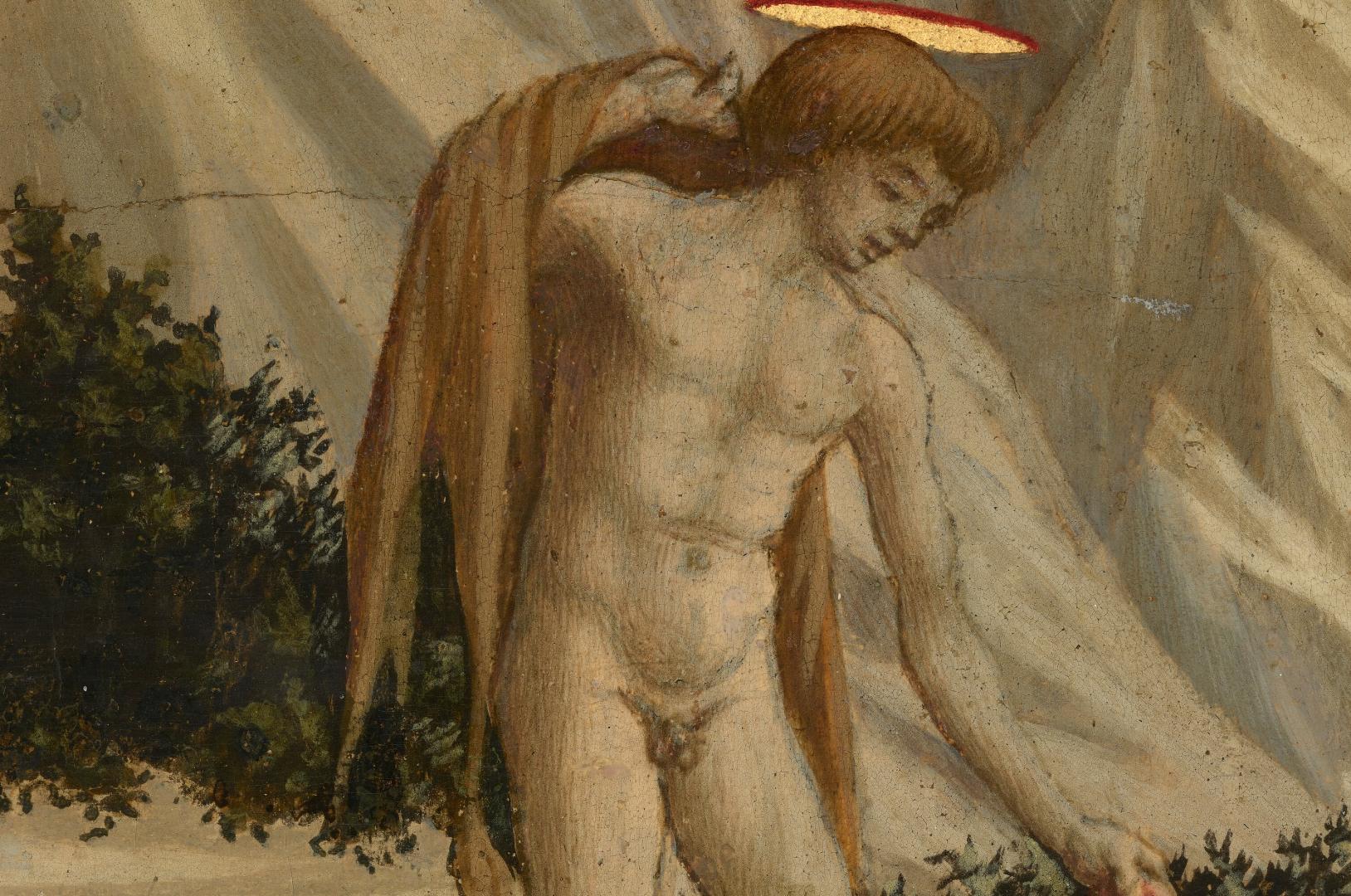 One of Domenico Veneziano‘s major works is an altarpiece that he painted about 1445 for the Church of Santa Lucia dei Magnoli, in Florence. The incident illustrated in this small panel from the base of the altarpiece is John’s act of exchanging his rich, worldly clothes for a rough, camel–hair coat. In the few known representations of John in the wilderness that preceded Domenico‘s version, the emphasis was placed either on the divine origin of the saint’s animal skin or on his preaching. Domenico, however, shifted attention from mere narration to the spiritual significance of John’s decision to forsake luxury in favor of a life of piety. Rather than showing the saint in the usual manner, as a mature, bearded hermit, Domenico painted a youthful figure. Clearly classical in appearance, his saint is one of the earliest embodiments of the Renaissance preoccupation with antique models. However, a fusion of pagan and Christian ideas is suggested; the Grecian type is transformed into a religious being by the golden halo above his head. Another innovative combination of elements exists in the arrangement of this male nude in a landscape that retains artistic features from the High Gothic era of the late Middle Ages. Symbolic rather than realistic, the rugged mountains enliven the drama of John’s decision by emphasizing the desolate nature of his chosen environment. (NGA)