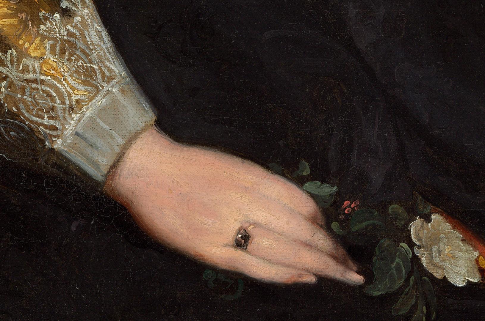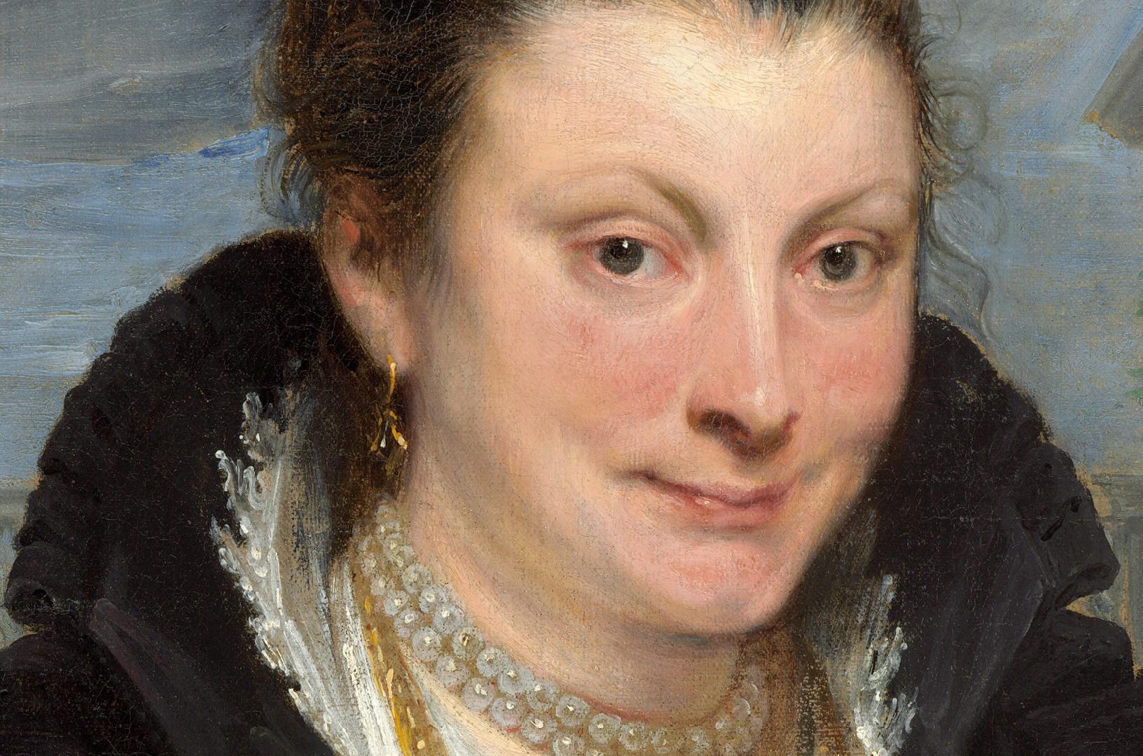 Isabella Brant was the first wife of the Antwerp master Peter Paul Rubens, whom she married shortly after his return from Italy in 1609. Just before Anthony van Dyck, one-time protégé and frequent collaborator of Rubens, left Antwerp in October 1621 for his own extended stay in Italy, he apparently presented this portrait to his mentor. Given the close personal and professional relationship between Van Dyck and Rubens, it is not surprising that Van Dyck, whose proficiency in portraiture was widely acknowledged at the time, would give a portrait of Rubens‘s beloved wife as a token of his appreciation for all his mentor had done for him. Van Dyck probably based this boldly executed portrait of Isabella on a likeness Rubens had drawn of his alert and smiling wife around 1620, and it is said that Rubens never ceased to praise Van Dyck‘s rendition. The monumental Italianate partition at the entrance to the garden at Rubens‘s mansion, an Antwerp landmark designed by the artist-owner himself as one of northern Europe’s first classically styled structures, provides a fitting setting. Rubens had placed sculptures of Mercury, god of painters, and Minerva, goddess of wisdom and learning, atop the screen. In his portrait, Van Dyck moved the statue of Minerva to an imaginary position behind Isabella‘s right shoulder, reinforcing the link between his sitter and the goddess. Van Dyck added to Isabella‘s liveliness and flair through the angled rhythms of the orange-red curtain behind her, the colorful elegance of her red-and-gold dress, the shimmering gold and jeweled chain draped across her chest, and the clouds passing across the blue sky. Isabella Brant died in 1626 at age 34 of the bubonic plague, leaving behind a desolate Rubens and three children. In 1772, Empress Catherine II of Russia (1729–1796) purchased the portrait as a work by Rubens for her Imperial Hermitage Gallery in Saint Petersburg. It was first correctly attributed to Van Dyck as early as 1895, but the debate about the painting’s authorship continued and Isabella Brant entered the collection of Andrew Mellon—and subsequently the National Gallery of Art—as a Rubens, only to receive its final reattribution to Van Dyck in 1976. (NGA)