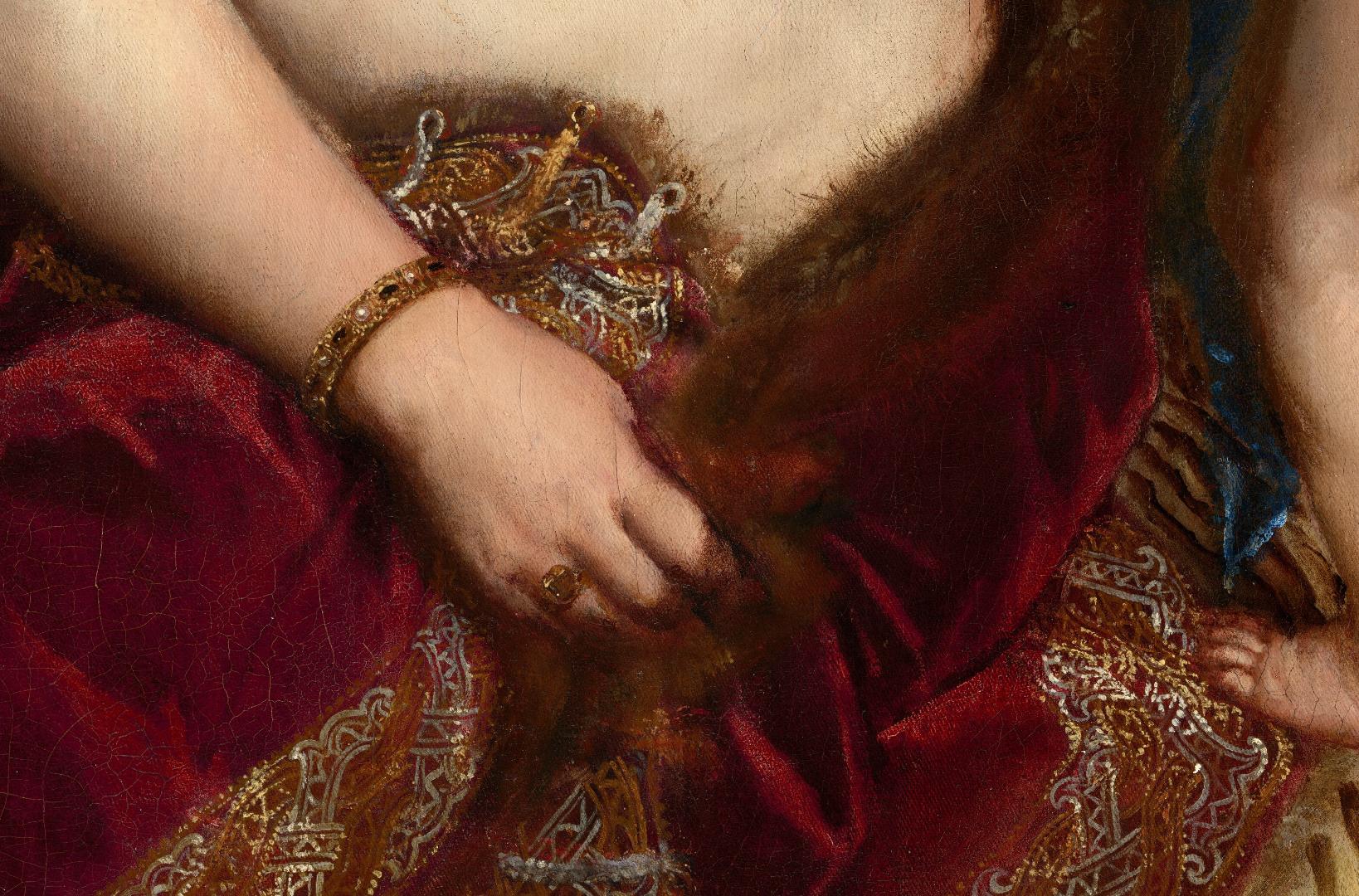 Titian’s goddess of love and beauty conjures the sense of touch. Observing her flushed cheek, one can almost feel its warmth. The textures of flesh, jewels, fabric, and fur are exquisitely detailed. In the mirror a cupid holds up to her, she appears not to view herself, but perhaps someone gazing at her. This is considered the finest surviving version of a composition executed in at least 30 variants by Titian and his workshop. It remained in the artist’s possession until his death, more than 20 years after he painted it. The reason Titian retained a painting of such high quality for so long is uncertain, but this Venus may have been a source of inspiration to those who worked for or visited the artist. For members of the workshop, she may have served as a model for replication, and the painting may have prompted visitors to order similar pictures for themselves. When he painted this work, Titian reused a canvas that once depicted two figures in three-quarter-length view standing side by side. He rotated the canvas 90 degrees, and it appears that he left exposed the jacket of the male figure in the underlying composition to create the luxurious fur-lined red velvet that now wraps around Venus’s hip. (NGA)