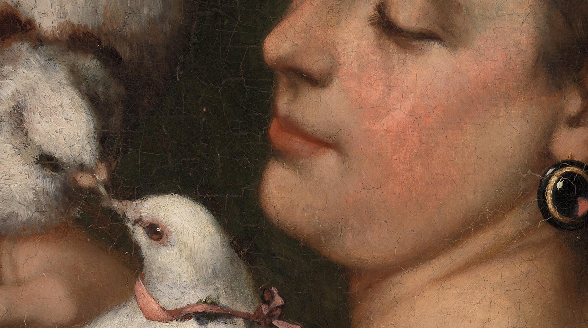 Though Gustave Courbet was best known for his early paintings of French peasants, in later decades he focused on scenes of animals, displaying his virtuosic talent for creating naturalistic depictions of stags, foxes, hounds, and birds. Here, Courbet adds two pigeons to this unconventional portrait, in which the subject turns slightly away from the viewer. Small details invite comparison between the woman and the birds. Ribbons adorn both the sitter’s hair and one of the pigeons, her earring glows like a bird’s eye, and the silken feathers seem to mirror the abundant waves of her hair. (Barnes)