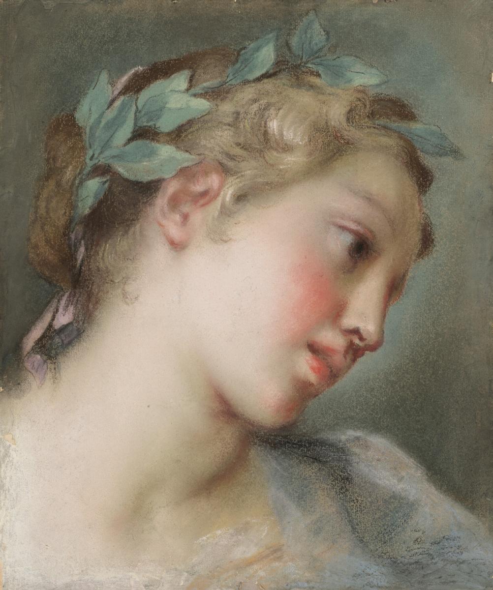 This alluring muse gracefully turns her head to the left, exposing a seductive neck and tender pink earlobe. Transparent gauze covers her shoulders. Rosalba Carriera rendered the porcelain skin, flushed cheeks, and wavy hair with subtly blended pastel colors, creating a soft, velvety surface. The intense contrast between the ivory flesh and dark background imbues the divine creature with radiance. This delicate head crowned by soft curls and an ivy wreath was one of many idealized images Carriera made called teste di fantasia –a kind of fanciful rendering of a beautiful woman with a mythological or allegorical appearance. Celebrated throughout Europe for her mastery of pastel, Carriera likely created this image for Augustus III, Elector of Saxony and King of Poland. (Getty)