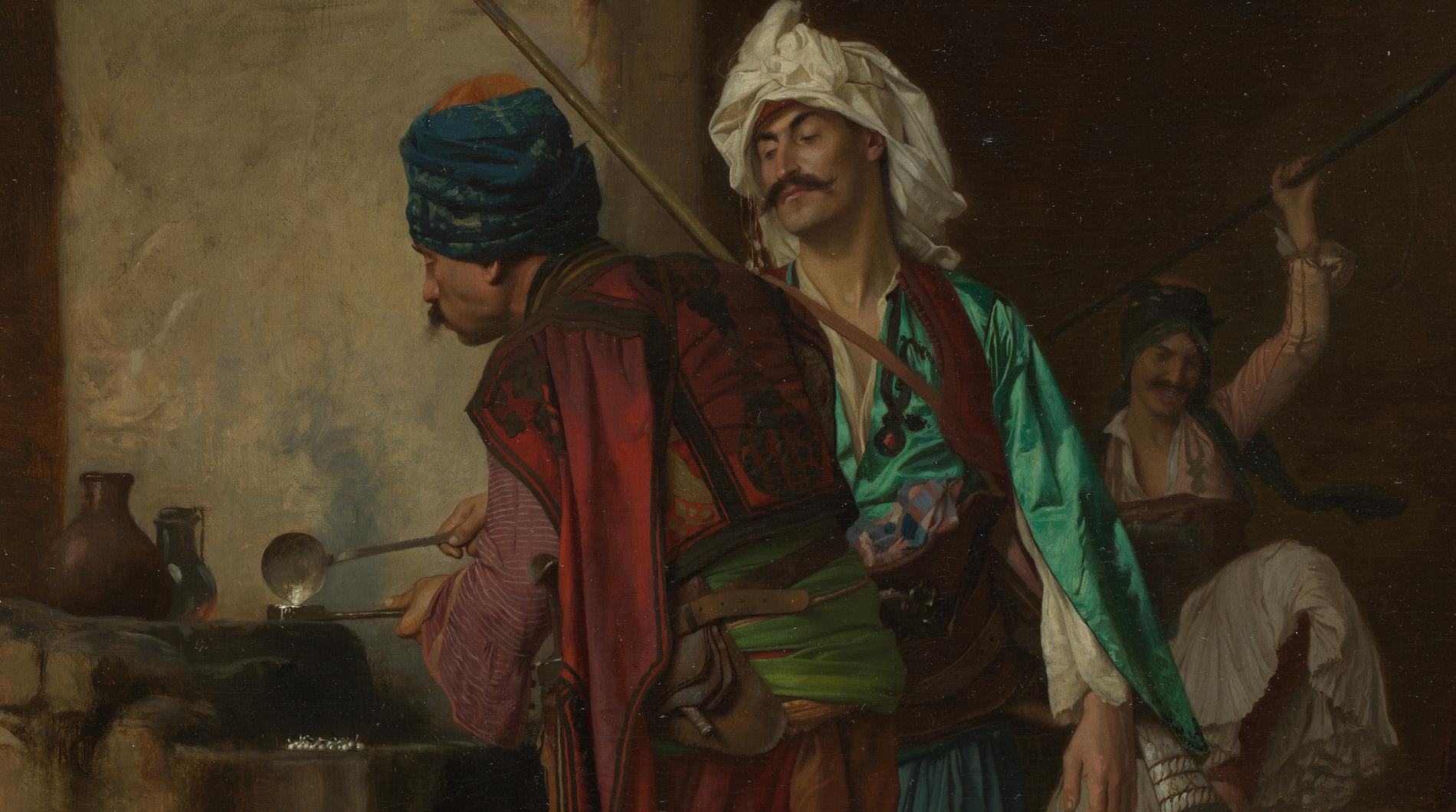 While two mercenaries cast bullets and a third, seated behind them, seems to be inspecting one, others engage in revelry and a man and woman converse. Despite these apparent incongruities, the meticulous painting technique renders the scene convincing. Gérôme traveled to Egypt many times from 1855 onward. His recollections of these journeys, together with objects that he brought back to Paris, became ingredients for scenes which today might be regarded as historical fictions. The title of this work derives from the stock book of Gérôme’s dealer, who bought the painting from the artist in 1884, presumably soon after he finished it. (MET)