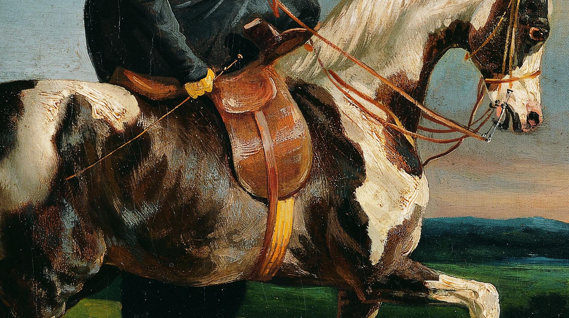 Géricault studied horses extensively throughout his life, and his stay in England in 1820–21 inspired a group of works representing elegant aspects of horsemanship and sport. The identity of this fashionably attired woman, who rides sidesaddle, is subject to speculation. Horse and rider are depicted in frieze-like profile, with the calm control she exerts over her mount standing in stark contrast to the portentous sky that distracts neither of them. Géricault here reconceives the traditional French image of a horsewoman, or Amazone, a term derived from ancient texts describing a fabled civilization of warrior women celebrated for their courage in battle. (MET)