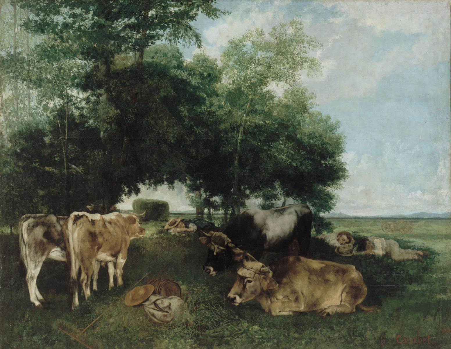 Like Constant Troyon (1810-1865) and Rosa Bonheur (1822-1899) a few years earlier, Courbet often depicted peaceful rural scenes in large formats. The Siesta during the haying season is in this sense characteristic of the changes in genres which occurred at the Salon during the French Second Empire. The rise of genre painting and development of historical painting led to changes in the traditional categories. When Gustave Courbet exhibited this painting, which was more than two metres in height with bovines in the foreground, he was following in the footsteps of Troyon. During the World Exhibition of 1855, the latter exhibited his monumental work Oxen at work, (Musée d’Orsay). More than four metres tall, this painting elevated animal painting to the same status as historical painting. Courbet had already used such large dimensions when exhibiting Damsels on the banks of the Seine (Musée du Petit Palais) at the Salon of 1857, an open-air scene with a realistic portrayal of human figures.