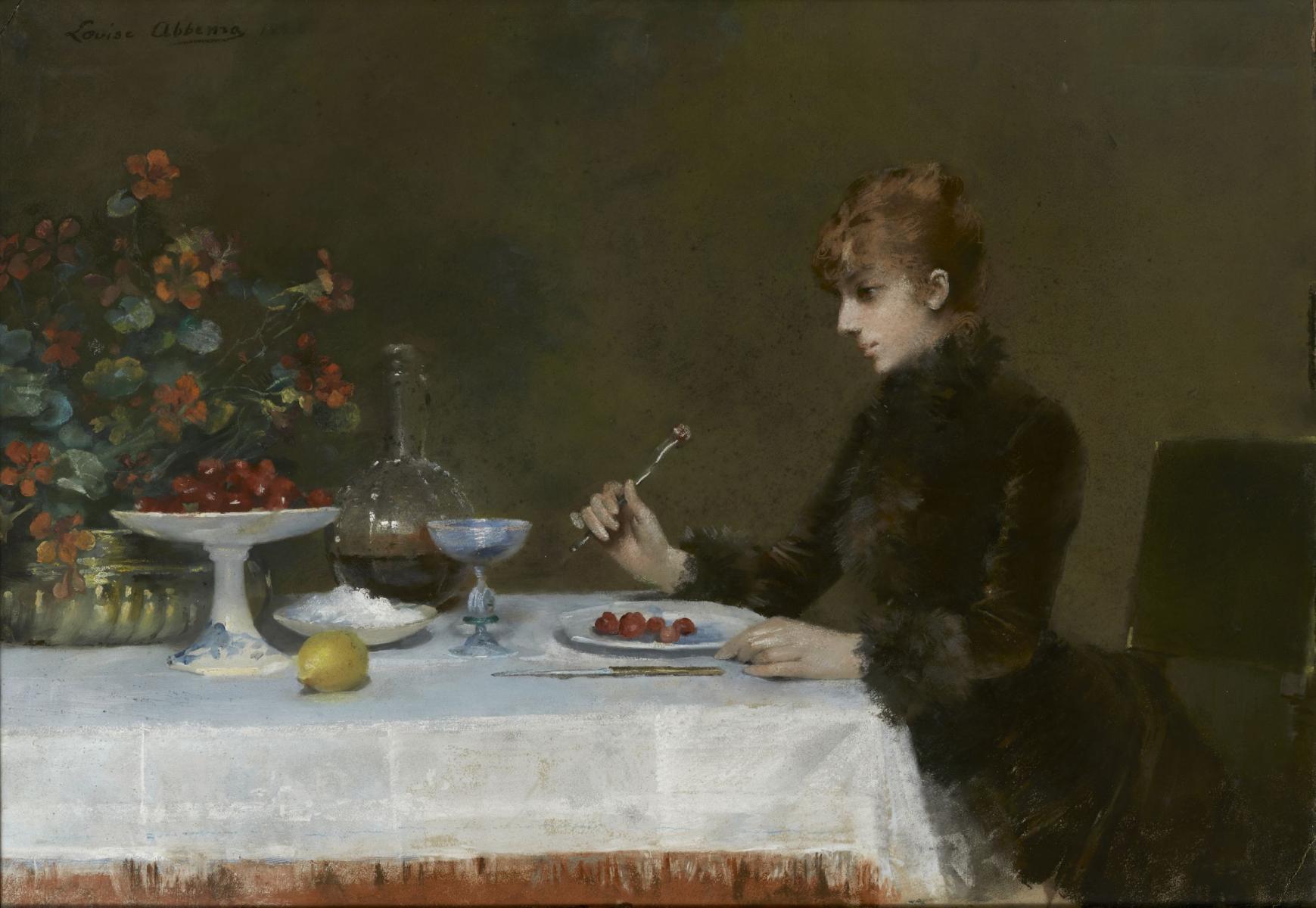 The pastel in the Petit Palais depicts Sarah Bernhardt at a table, enjoying a light meal of cherries and wine. The actress is recognizable by her slender figure and her “fluffy” red hair, styled in a high chignon characteristic of the actress’s hairstyle in the 1870s and 1880s. She wears an elegant day dress, trimmed with fur, which reflects her taste for fashion and contrasts, in its simplicity, with the exuberance of the stage costumes in which artists (Clairin, Mucha, etc.) often portrayed Sarah Bernhardt.