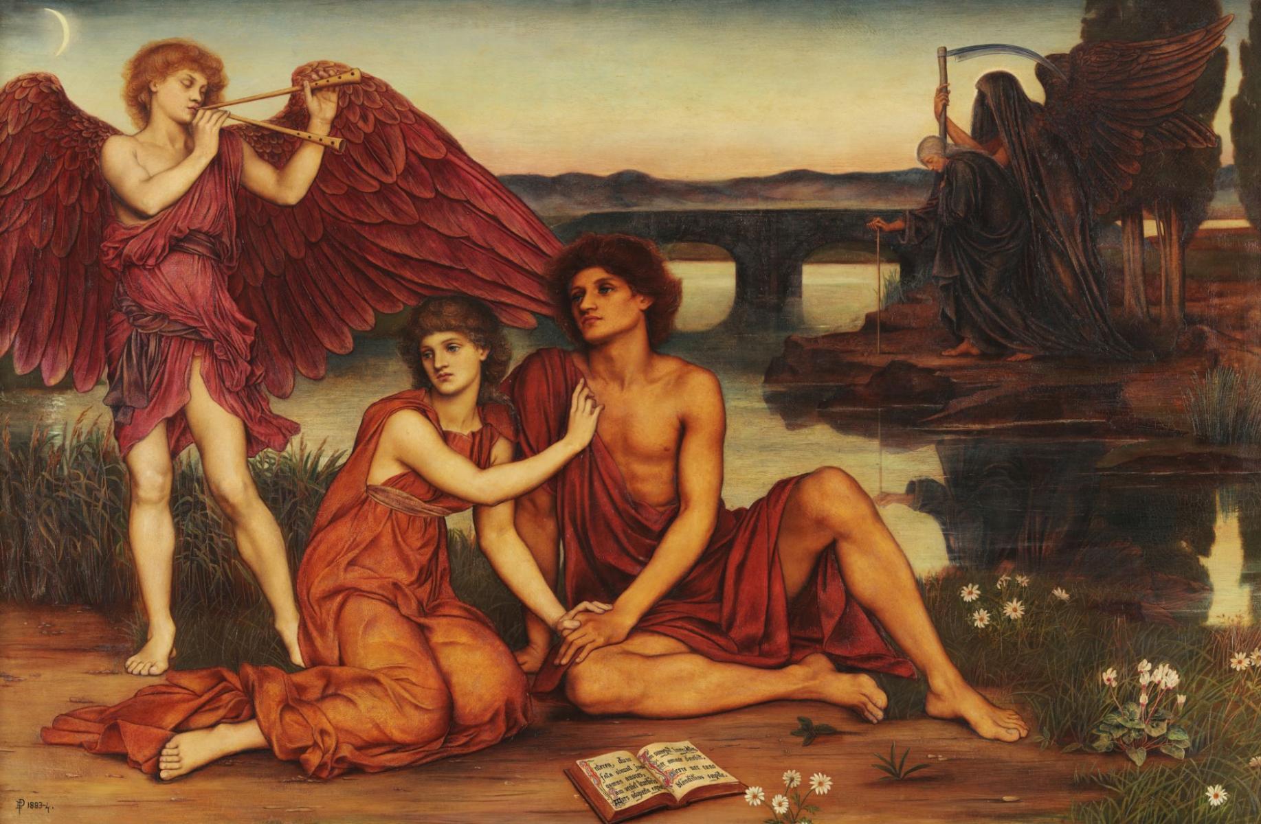 This painting is an allegory for the passing of time and the life cycle. The lovers in the foreground sit listening to the piping angel, with wonderful outstretched red wings. The male figures seems entranced, but the woman is distracted. The book open before them holds the key to her distress as it shows a passage from an Elegy of the Roman poet Tibullus, where the writer imagines dying in his lover’s arms, and considers her grief at his funeral.